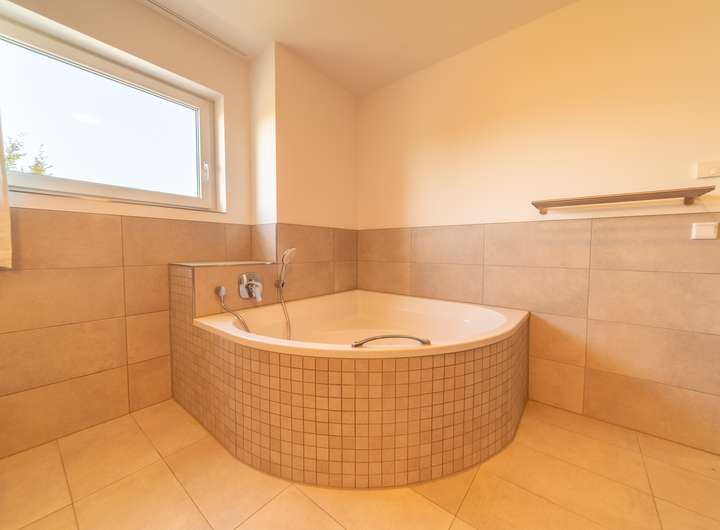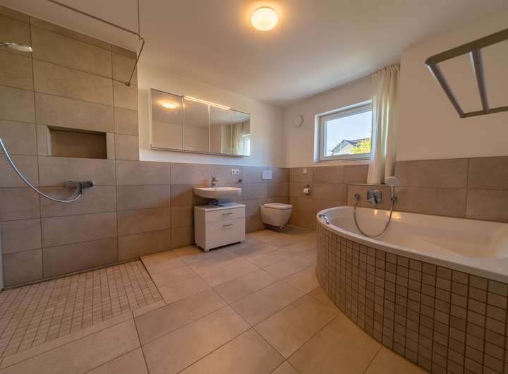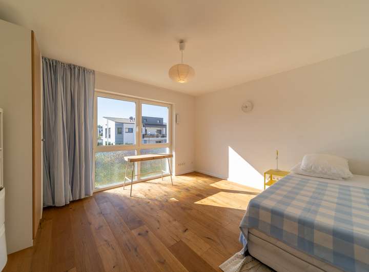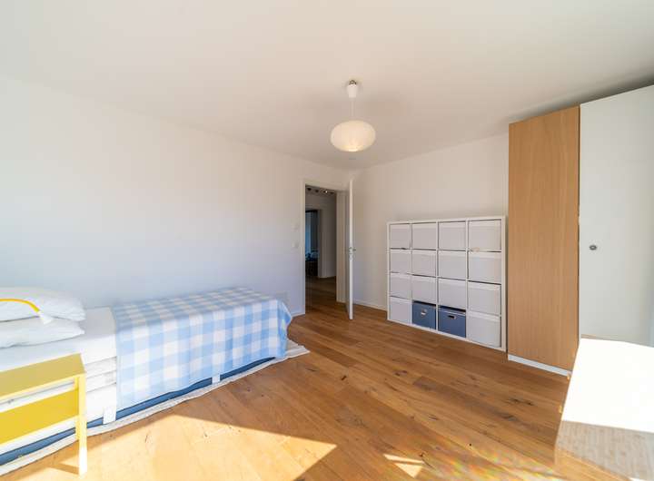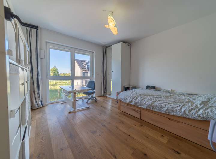 Das Obergeschoss umfasst drei helle Schlafzimmer mit bodentiefen Fenstern, die für viel Licht sorgen. Ein großes Bad mit XXL Eckbadewanne und bodengleich gefliester Dusche sorgt hier für Komfort. Zusätzlich gibt es ein separates weiteres WC. Der Boden ist mit Landhausdielenparkett in Eiche versehen, was den Räumen eine warme Atmosphäre verleiht.