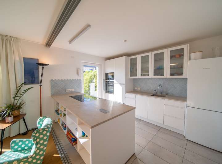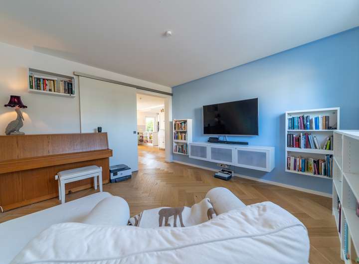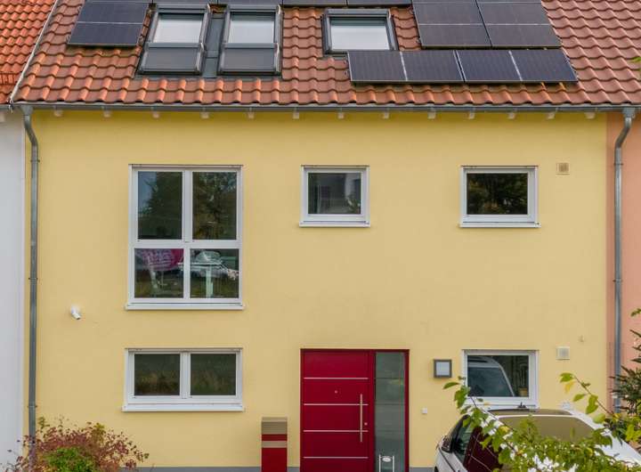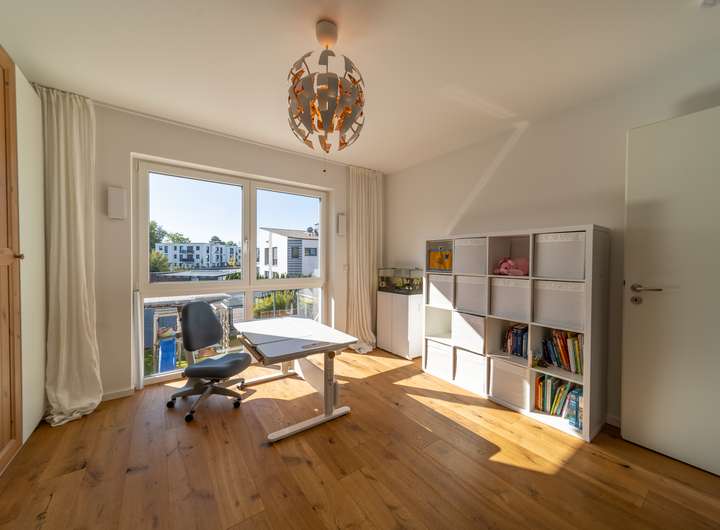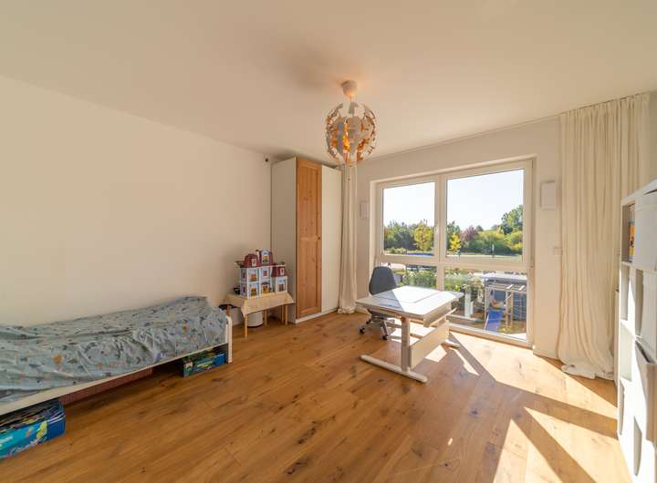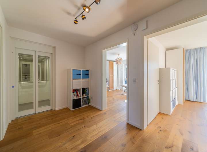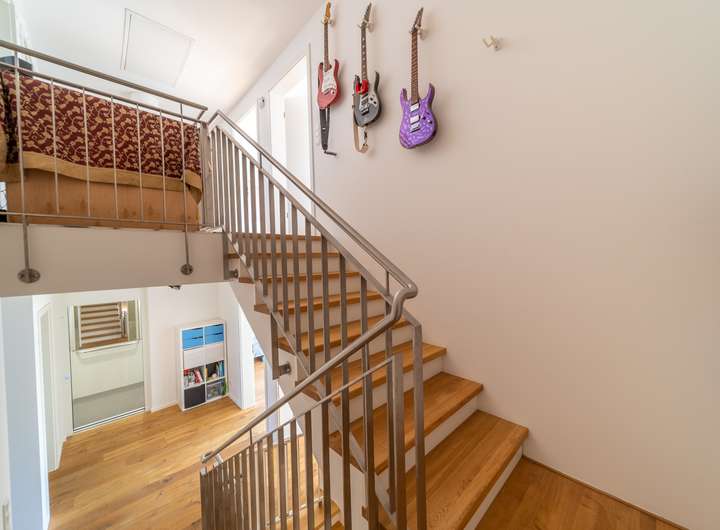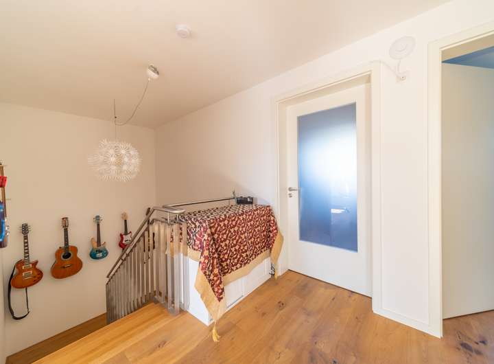 Auch technisch ist das Haus ideal für die Zukunft ausgestattet: Alle Räume verfügen über CAT-Netzwerkverkabelung, die im Haustechnikraum zusammenlaufen. Elektrische Rollläden sorgen für Komfort – sogar im Dachgeschoss -, im Erdgeschoss zur Gartenseite wurden Raffstores verbaut. Die Heizungsversorgung erfolgt über eine Erdwärmepumpe und liefert über die Fußbodenheizung im Winter angenehme Wärme und sorgt im Sommer für kühlere Temperaturen. Die Wärmedämmfenster sind 3-fach verglast und das Haus verfügt über eine dezentrale Lüftungsanlage der Firma Airfox. Der Endenergiebedarf liegt bei A+. Eine Photovoltaikanlage auf beiden Dachseiten erzielte im Jahr 2024 einen Ertrag von rund 11.000 kWh – genug, um Wärmepumpen- und Haushaltsstrom abzudecken und zusätzlich eine Einspeisevergütung zu erzielen (verbrauchsabhängig).