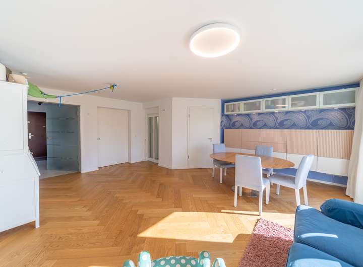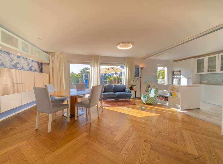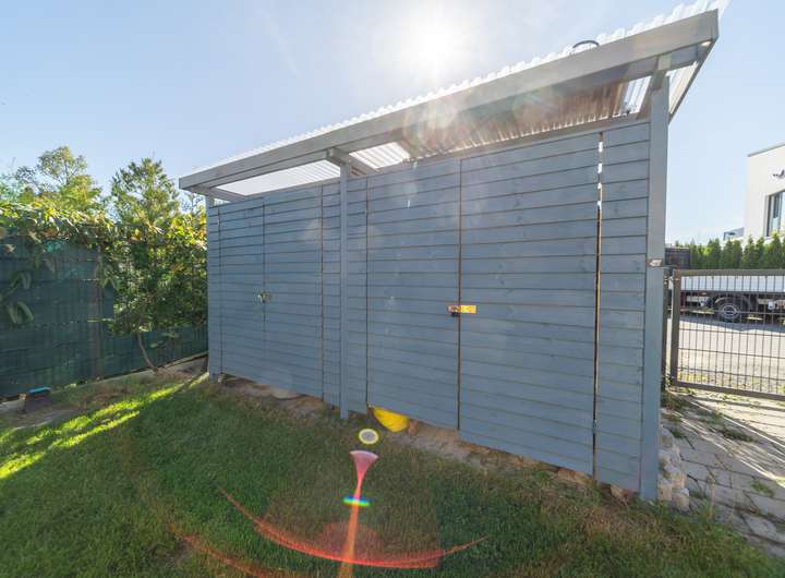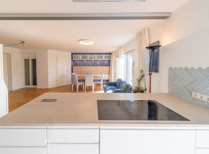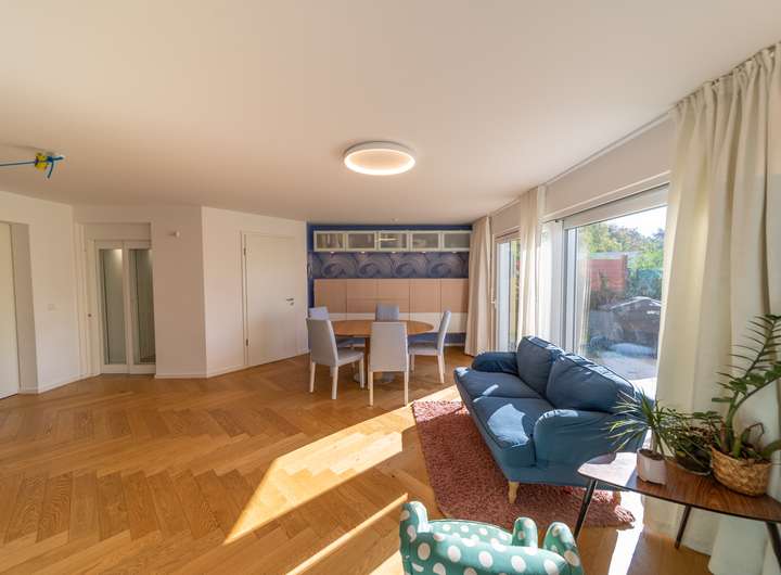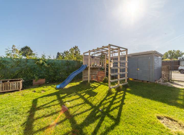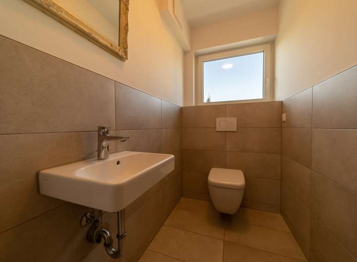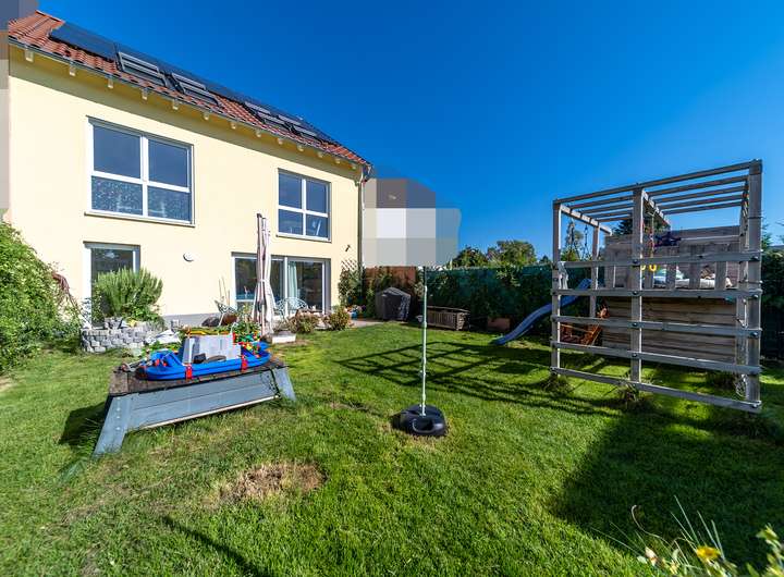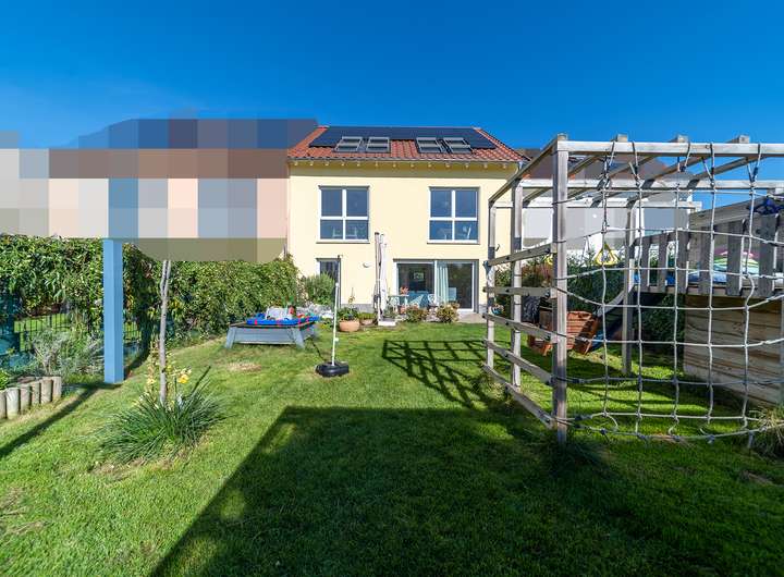 Auch technisch ist das Haus ideal für die Zukunft ausgestattet: Alle Räume verfügen über CAT-Netzwerkverkabelung, die im Haustechnikraum zusammenlaufen. Elektrische Rollläden sorgen für Komfort – sogar im Dachgeschoss -, im Erdgeschoss zur Gartenseite wurden Raffstores verbaut. Die Heizungsversorgung erfolgt über eine Erdwärmepumpe und liefert über die Fußbodenheizung im Winter angenehme Wärme und sorgt im Sommer für kühlere Temperaturen. Die Wärmedämmfenster sind 3-fach verglast und das Haus verfügt über eine dezentrale Lüftungsanlage der Firma Airfox. Der Endenergiebedarf liegt bei A+. Eine Photovoltaikanlage auf beiden Dachseiten erzielte im Jahr 2024 einen Ertrag von rund 11.000 kWh – genug, um Wärmepumpen- und Haushaltsstrom abzudecken und zusätzlich eine Einspeisevergütung zu erzielen (verbrauchsabhängig).