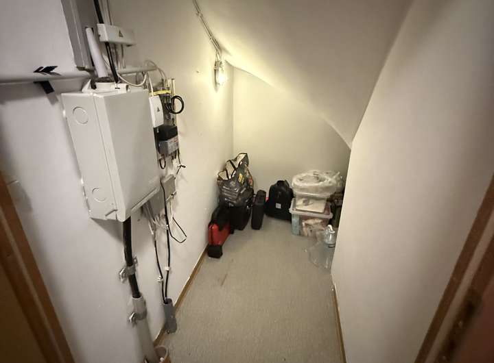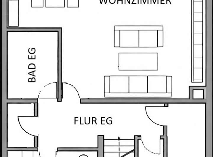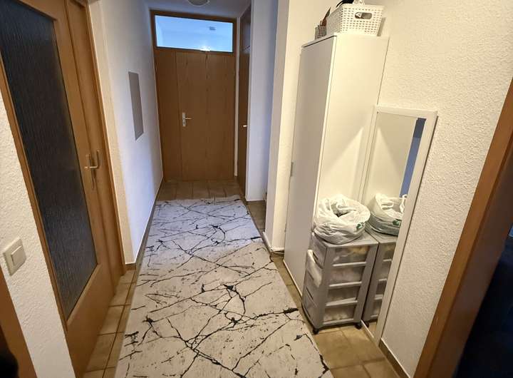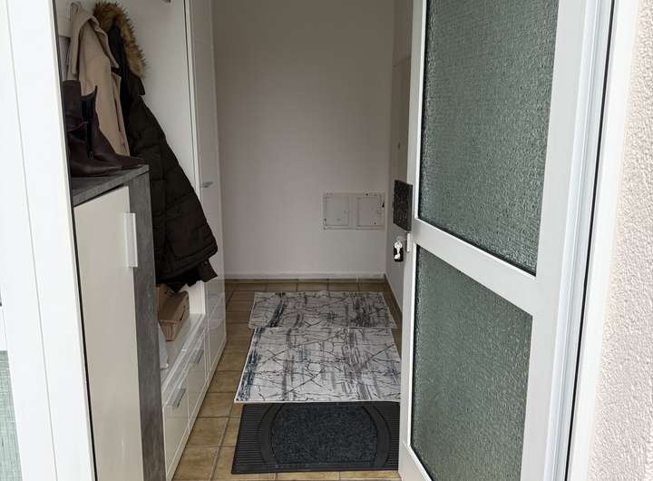 Der Eingangsbereich führt in einen Vorflur, der sich für die Unterbringung einer Garderobe eignet. Über eine weitere Tür gelangt man in den Flur des Erdgeschosses. Hier befinden sich ein Abstellraum unter der Treppe sowie ein weiterer Abstell- bzw. Anschlussraum am Ende des Flures.