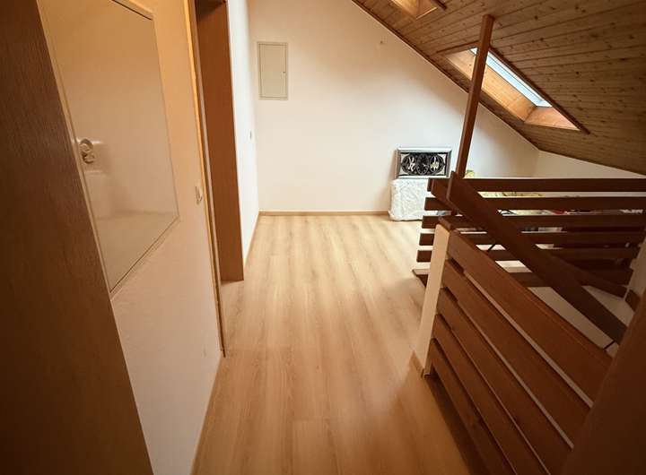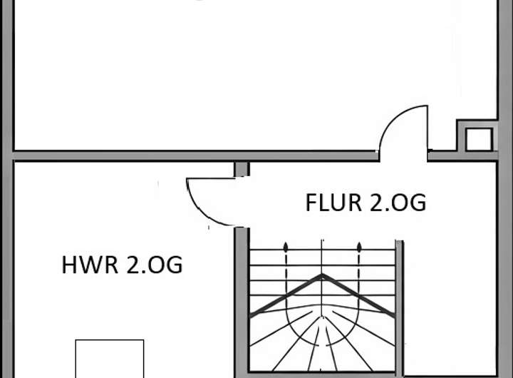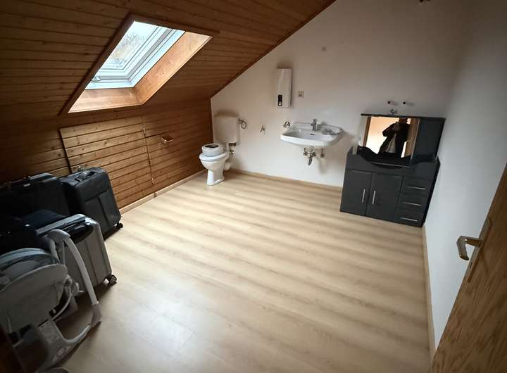 Das 2. Obergeschoss ist über ein weiteres Treppenhaus erreichbar und als Sichtdachstuhl ausgeführt. Eine Diele unter der Dachschräge erschließt das Dachgeschosszimmer, das trotz der teilweise vorhandenen Schräge ein angenehmes Raumgefühl bietet. Zwei Dachflächenfenster sowie ein Fensterband im Giebelstreifen sorgen für eine gute Belichtung. Ergänzt wird diese Ebene durch einen Hauswirtschaftsraum mit Abstellkammer im Kniestock sowie WC und Waschbecken.
