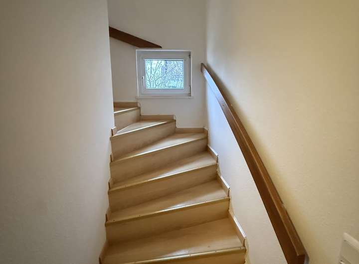 Zur Vermietung steht ein Reihenmittelhaus mit Pultdach aus den 1980er-Jahren mit Wohnraum auf drei Etagen. Die Nachbarhäuser sind leicht versetzt angeordnet und doppelwandig voneinander getrennt, was zu einer angenehmen Wohnruhe beiträgt.