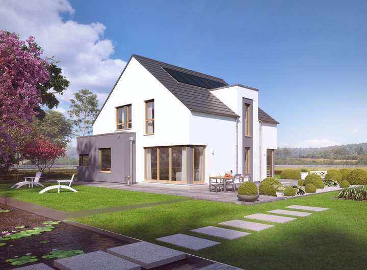 Mit rund 164 m² Wohnfläche auf zwei Ebenen bietet dieses Haus Raum für individuelle Lebensmodelle - ob Familienleben mit Kindern, stilvolles Arbeiten von zu Hause oder Wohnen mit Gästen. Das klassisch-moderne Satteldach verleiht dem Haus eine harmonische Silhouette und fügt sich perfekt in viele Bebauungspläne ein.