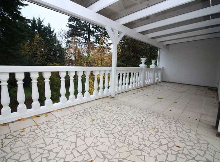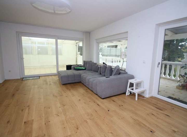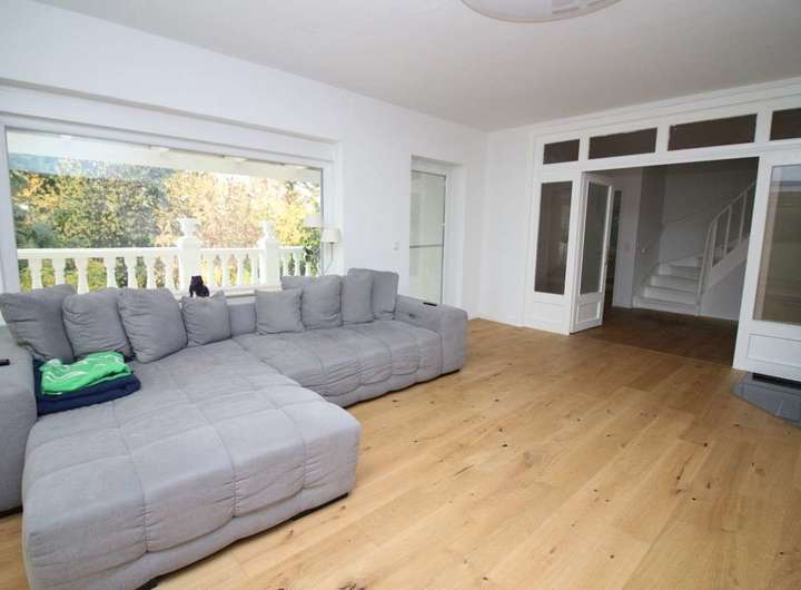 Vom geräumigen Wohnzimmer mit Kamin gelangen Sie durch eine große Panoramaglastür auf die prachtvolle Terrasse mit Blick auf den durch alten Baumbestand umrahmten uneinsichtigen Garten.