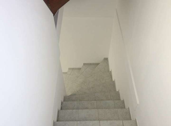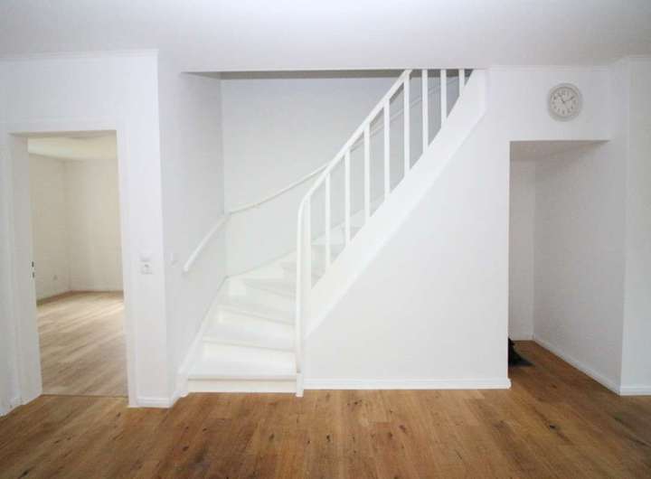 Die weiße Holztreppe ins Obergeschoss und Zimmertüren wurden neu geschliffen und lackiert.