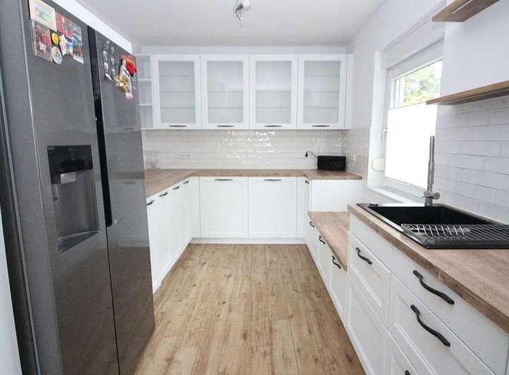 Das Herzstück des Hauses ist die neuwertige Einbauküche mit allen notwendigen Elektrogeräten und neuer Elektrik, sowie komplett getauschter Wasser- und Abwasserleitungen. Der Backofen und Geschirrspüler sind rückenfreundlich halbhoch angebracht und ein moderner Side-by-Side Kühlschrank mit Wasserspender und Eiswürfelbereiter gehören zur Ausstattung dazu.