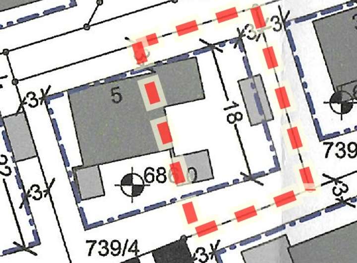 Dieses ebene Grundstück mit der Bezeichnung 739/4 ist derzeit noch mit einem Altbestand bebaut. Bis zu Baubeginn ist die Beseitigung zugesagt.