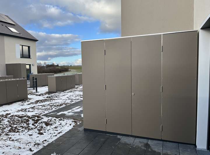 Des Weiteren gehören zum Haus zwei Stellplätze (zuzüglich jeweils 60 €) sowie ein Vorgarten mit beleuchtetem Vorgartenschrank.