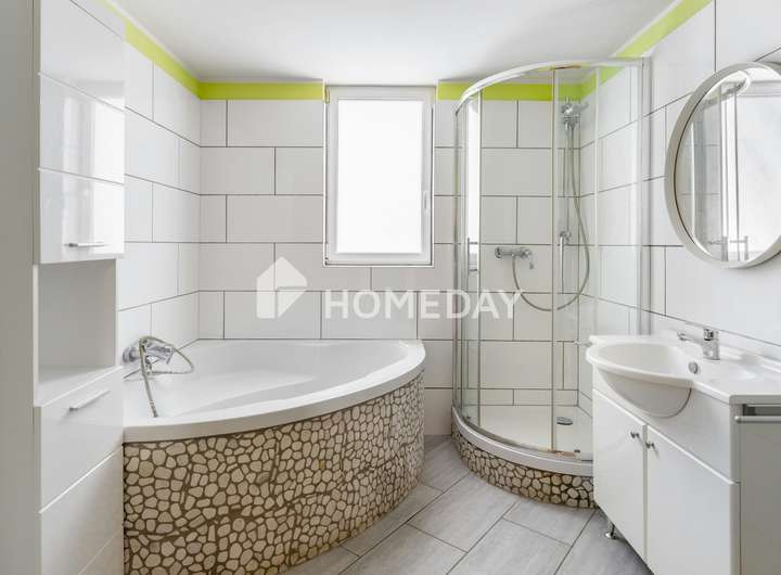 Ein weiteres Highlight ist das stilvolle Tageslichtbad, das mit einer großen Eckbadewanne und einer geräumigen Dusche zum Entspannen einlädt. Wellnessmomente in den eigenen vier Wänden sind hier garantiert!