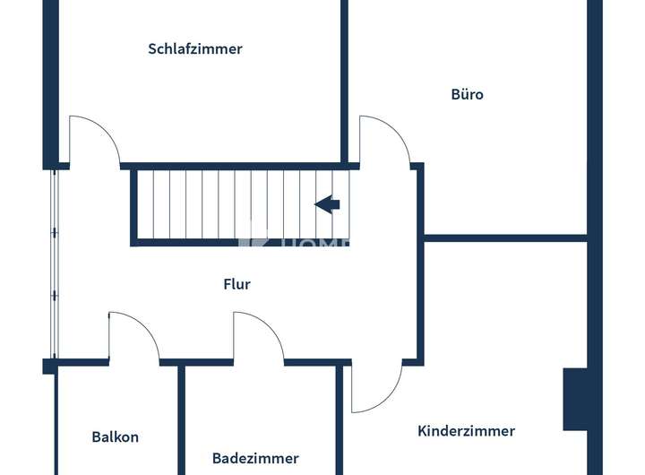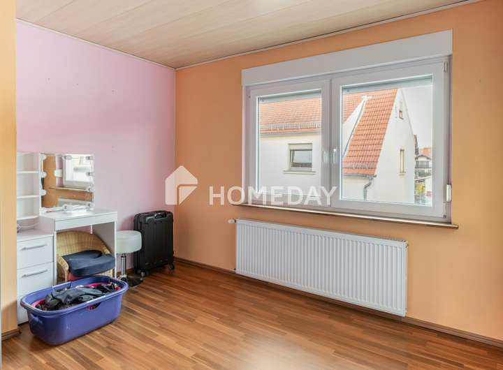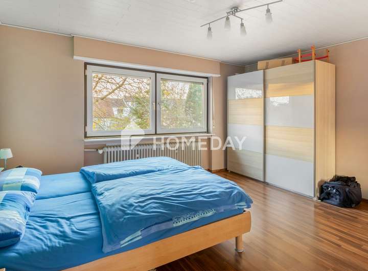 Im Obergeschoss liegen drei gut geschnittene Zimmer, die sich klar und flexibel möblieren lassen. Das Büro hat Zugang zur Loggia, die nach Westen ausgerichtet ist, und der kleine Balkon ist vom Flur erreichbar. Das Tageslichtbad ist erneuert und bietet Stauraum. Der Grundriss wirkt stimmig, die Wege sind kurz, die Räume haben angenehme Proportionen.