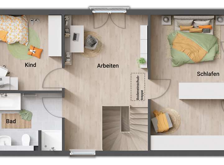 Die praktische Grundrissgestaltung macht das „Aura 125“ zu einem wahren Raumwunder, trotz der kompakten Baumaße. So kann zum Beispiel die Treppe im Haus einläufig geplant werden, sodass unterhalb Platz für einen Einbauschrank oder eine gemütliche Spielecke für die Kleinen entsteht. Während in den meisten Fluren nur unzureichend Stellmöglichkeiten für geräumige Schränke eingeplant ist, wird im Stadthaus Aura die Diele effizient genutzt und bietet somit ausreichend Stauraum für Jacken, Schuhe und Taschen. Ein praktisches Haus für seine Bewohner und Gäste.