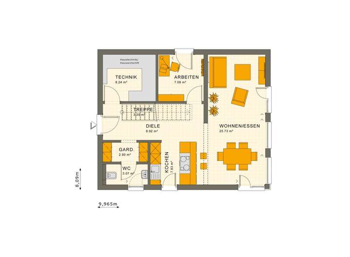 Der großzügige Ess-Koch-Wohn-Bereich bildet das Herzstück des Hauses. Mit offener Gestaltung lädt dieser Bereich zum gemeinsamen Kochen, Essen und Entspannen ein. Hier können Sie Ihre Familie und Freunde bequem empfangen und schöne Momente gemeinsam verbringen.