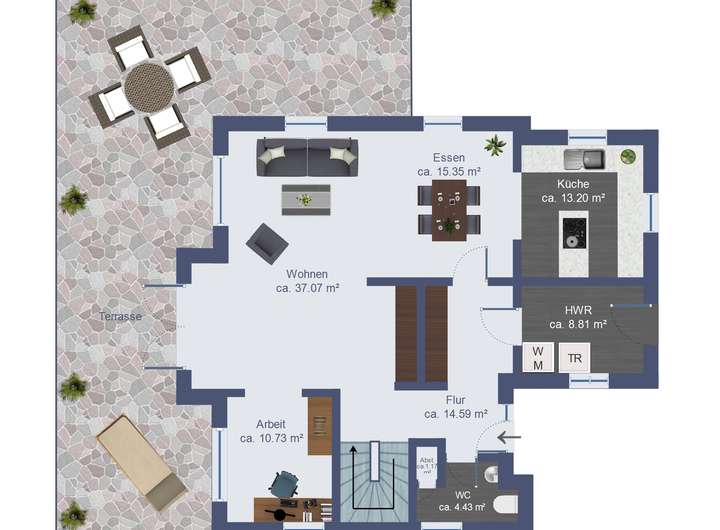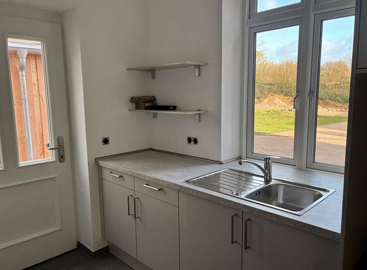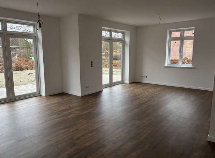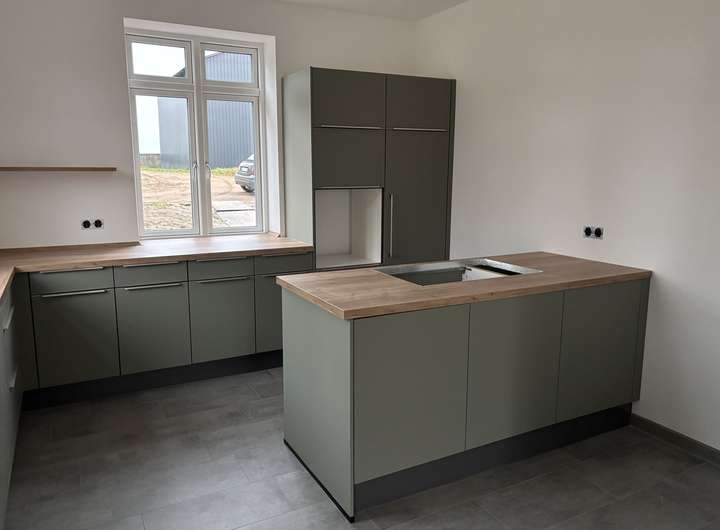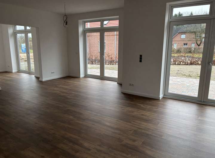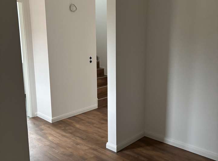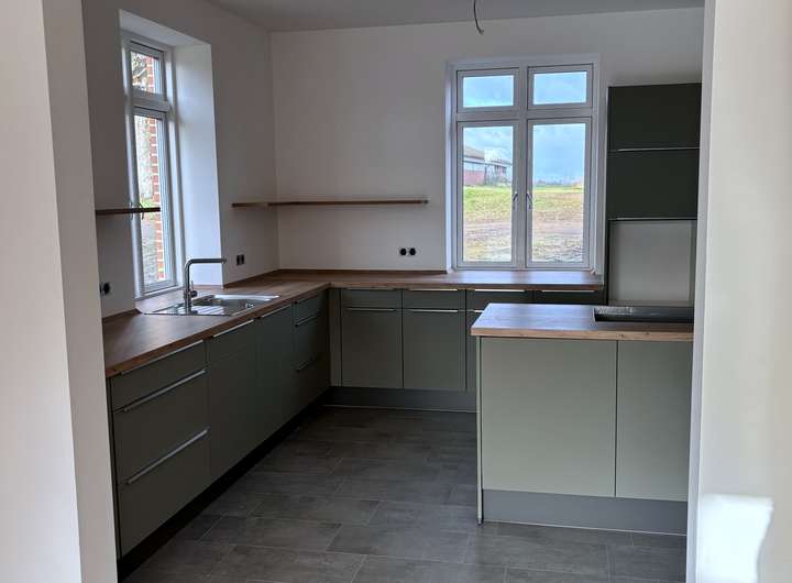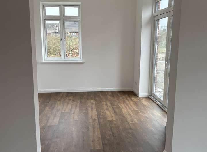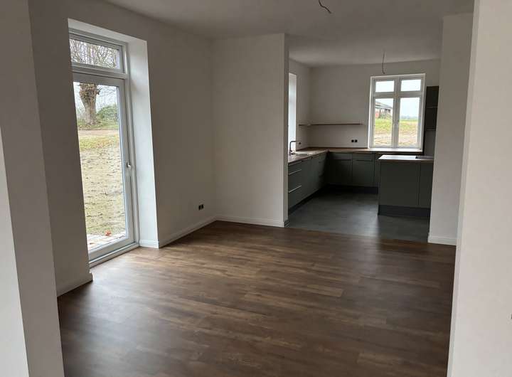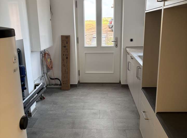 Betreten Sie den Flur, in dem sich zur linken Seite des Gäste-Bad mit Dusche befindet. Links befindet sich der Hauswirtschaftsraum mit Einbauelementen, der Technik sowie einer Tür nach Außen. Gerade aus finden sich die Küche mit einer modernen Einbauküche, der offene Essbereich sowie ein sehr heller und großzügiger Wohnbereich mit Zugang auf die Terrasse. Ein Arbeitszimmer, welches noch mit einer modernen Tür im Industriestyle ausgerüstet wird, grenzt an das Wohnzimmer.