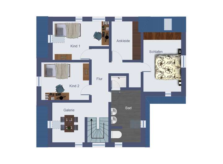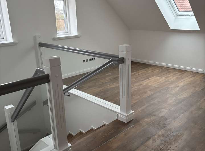 Über die Treppe gelangen Sie ins das Obergeschoss mit einer offenen Galerie. In dieser Etage befinden sich 4 Zimmer sowie ein sehr großes Bad mit Dusche.