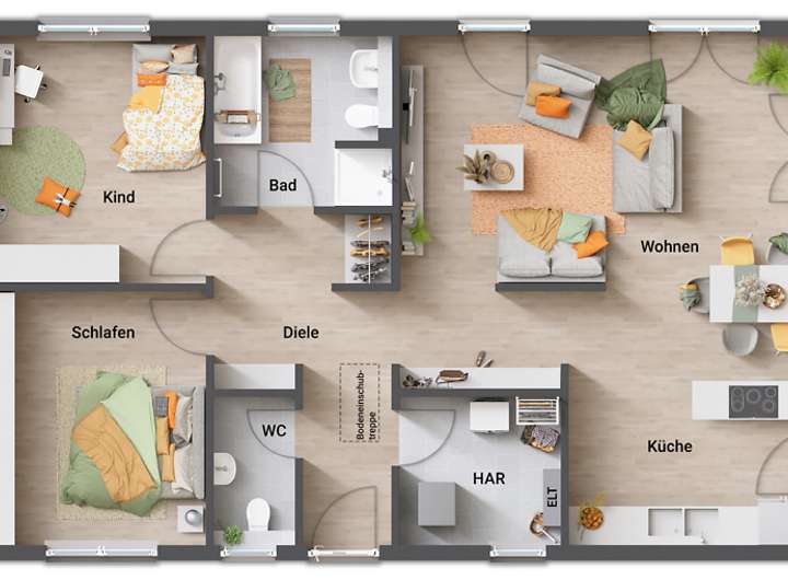 Der offen gestaltete Wohn-, Koch- und Essbereich ist das Zentrum des Familienlebens. Hier wird gemeinsam gekocht, gelacht und entspannt. Die bodentiefen Fenster lassen nicht nur viel Licht hinein, sondern ermöglichen auch vielfältige Zugänge zum Garten. Ob von der Küche oder vom Sofa aus, Ihre Wohlfühloase im Grünen ist stets nur ein paar Schritte entfernt. Besonders praktisch und platzsparend ist die integrierte Garderobe im Flur. Außerdem gibt es verschiedene Wohnbereiche, die auf Wunsch mit (Glas-)Türen abgetrennt werden können.