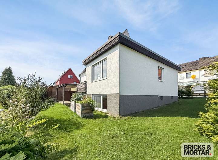 Der überdachte Freisitz im Garten (Zugang über den Gartenweg) ist Ihr wettergeschützter Platz für BBQ, lange Sommerabende und Kindergeburtstage. Dazu bietet das Grundstück reichlich Fläche für Rasen, Beete, Spielbereich – ohne Kompromisse. Ein großer Schuppen mit Garagenfunktion plus zusätzlicher Stellplatz nimmt Auto, Bikes, Werkzeuge und Gartengeräte auf. Satteldach am Haupthaus, Flachdach am Anbau und die massive Bauweise stehen für Wertstabilität und Langlebigkeit.