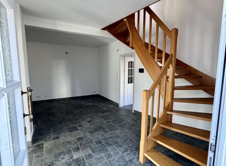 Beim Eintreten gelangen Sie linkerhand direkt in den gemütlichen Wohnbereich mit Holzkamin – ideal für entspannte Abende. Zusätzlich kann das Erdgeschoss wahlweise über Fußbodenheizung, über klassische Heizkörper oder über den Holzkamin beheizt werden.