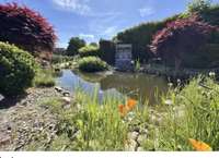 Der Vordere Teil des Gartens mit Teich gehört ebenso zu der Haushälfte sowie die Terasse mit einer schönen Blockhütte.