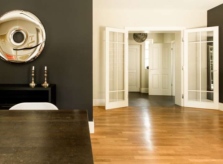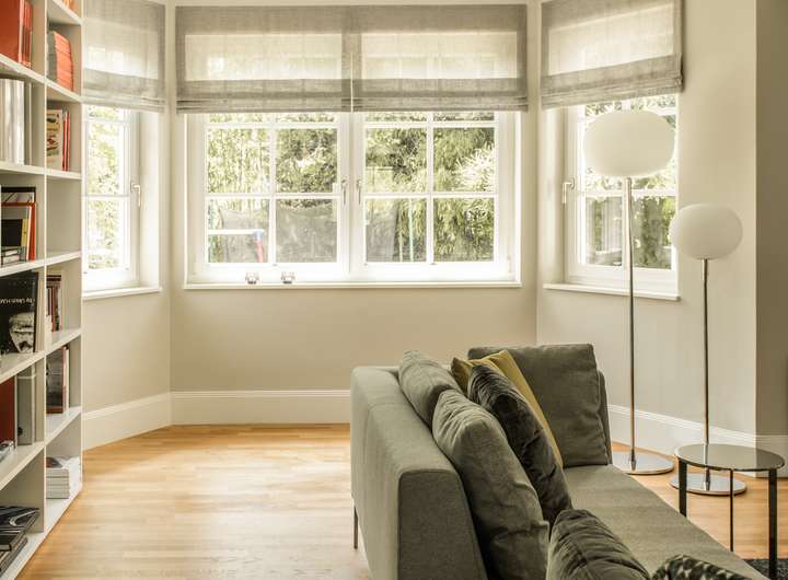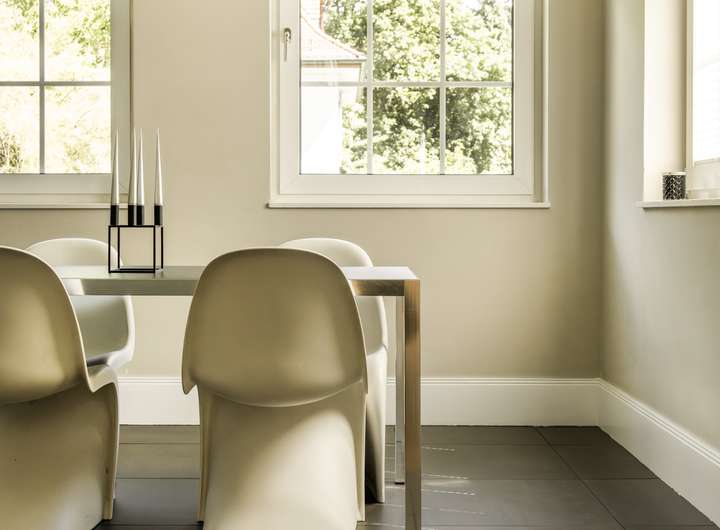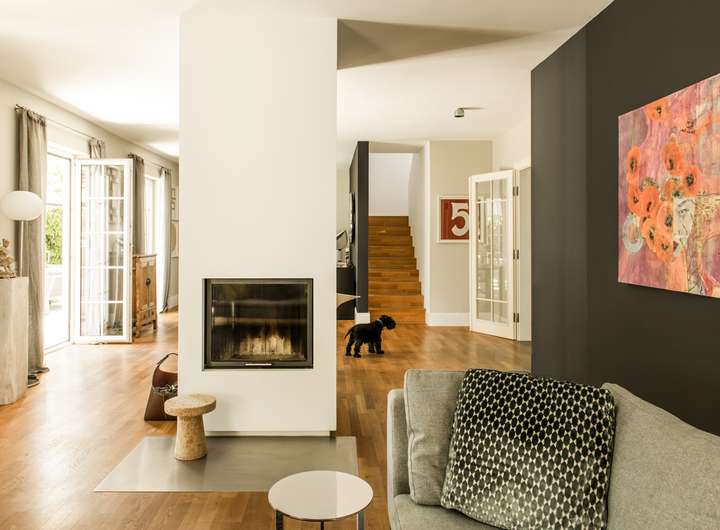 Das Herzstück des Hauses bildet der weitläufige Wohn- und Essbereich mit offenem Kamin. In den kühleren Monaten knistert hier das Feuer einladend, während bodentiefe Sprossenfenster den Blick in den Garten freigeben und den Raum mit natürlichem Licht durchfluten. Im Sommer öffnen sich französische Türen weit zur Terrasse - der Duft blühender Sträucher zieht herein.