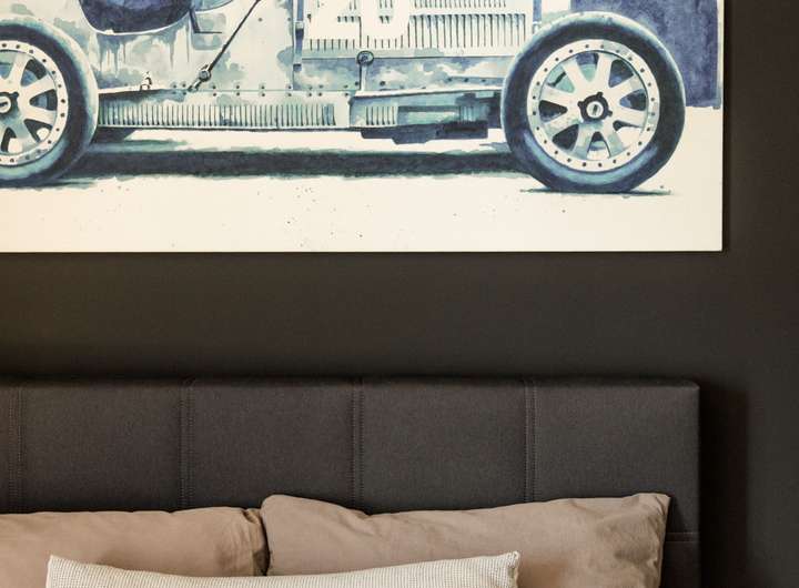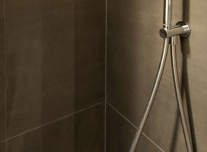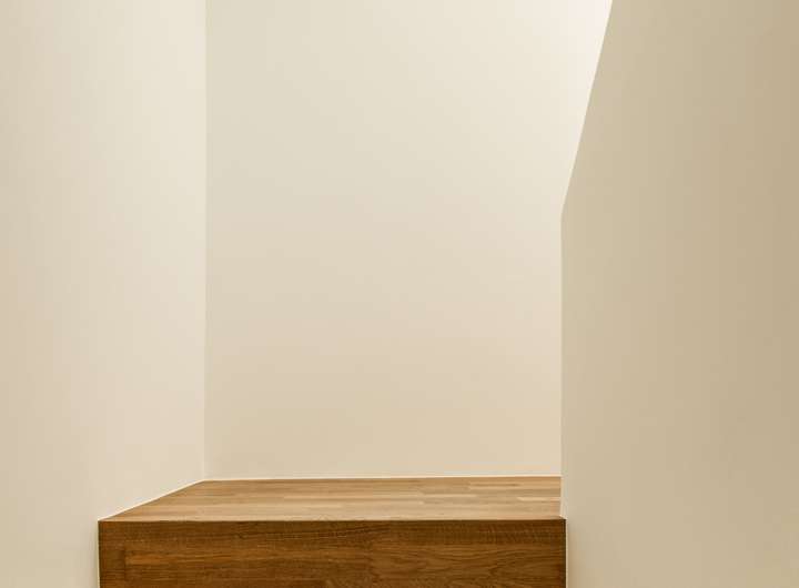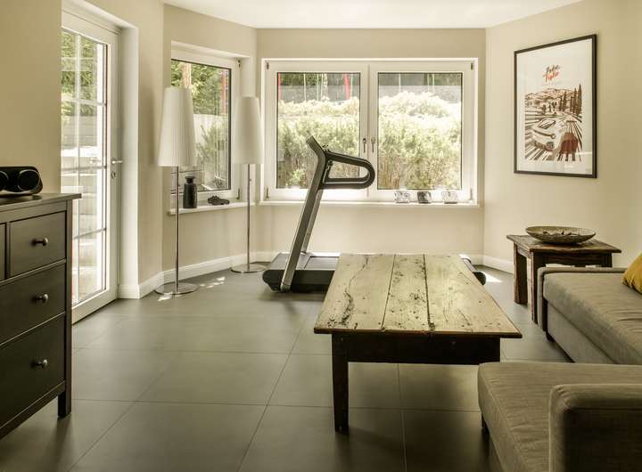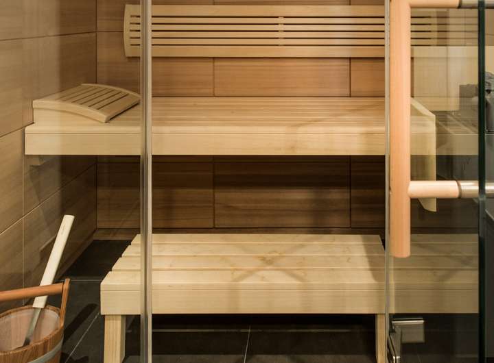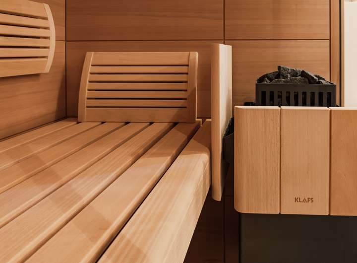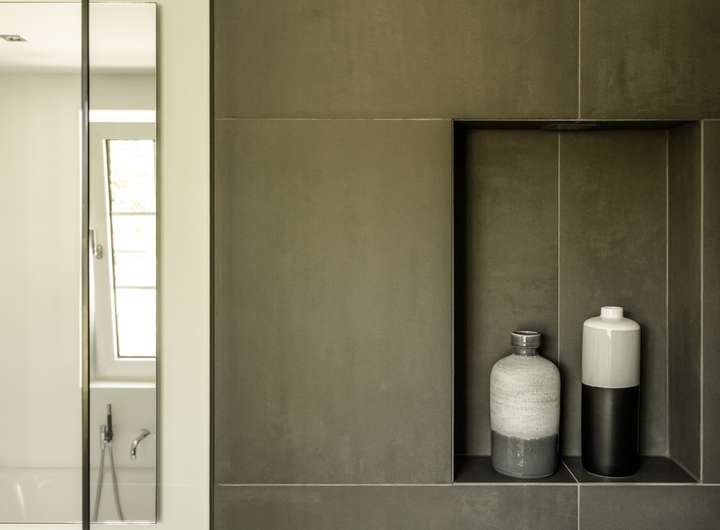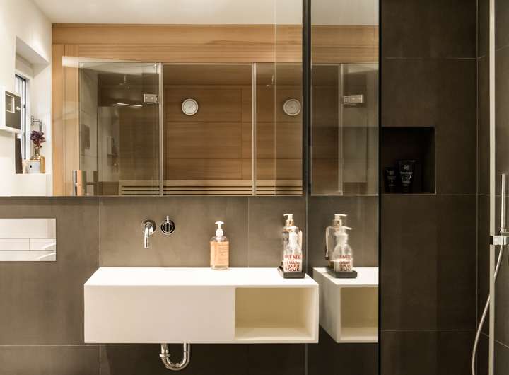 Drei Tageslichtbäder führen das gestalterische und funktionale Konzept fort, ausgestattet mit exklusiven Armaturen von Vola. Das Spa-inspirierte Badezimmer im Gartengeschoss mit Klafs-Sauna und Rainshower wird zum privaten Wellnessbereich. Hier beginnt der Tag mit einem sonnenverwöhnten Bad oder klingt in gedämpftem Licht und wohliger Wärme aus. Ergänzt wird dies durch ein separates Gäste-WC im Erdgeschoss mit puristischen Keramikelementen von Boffi Italia - dezent platziert nahe der Küche und auf dem Weg zur Doppelgarage.