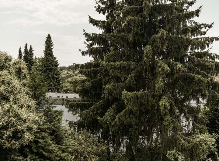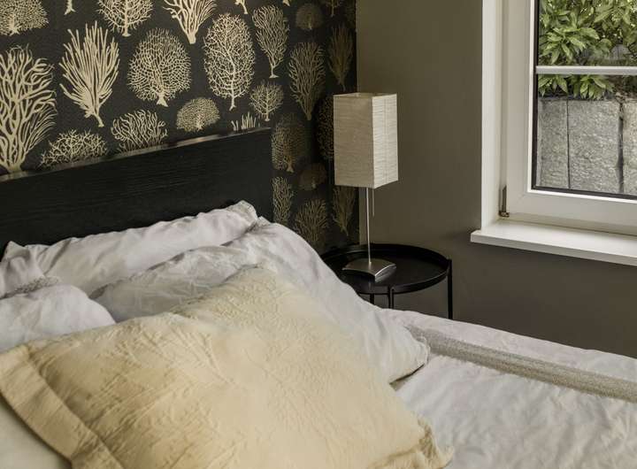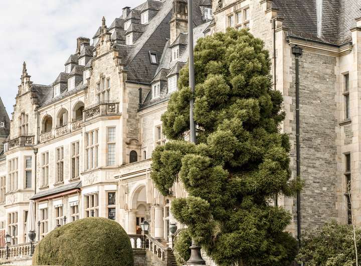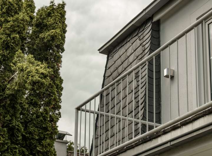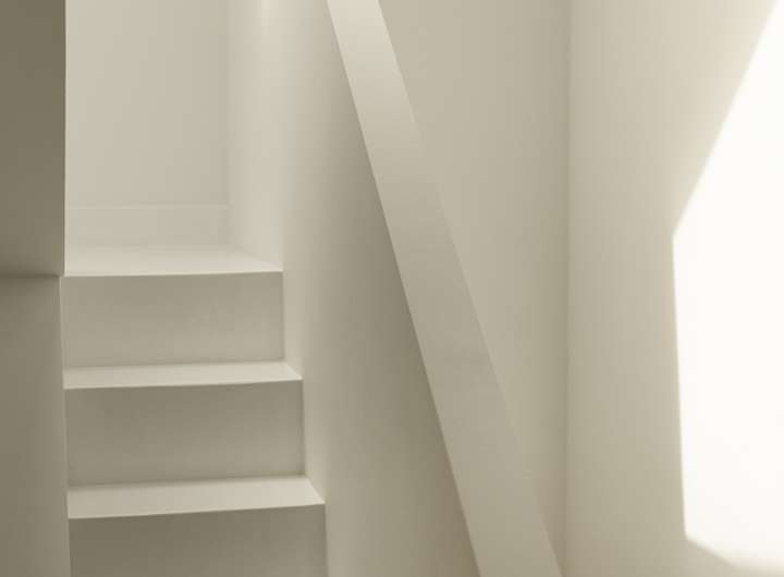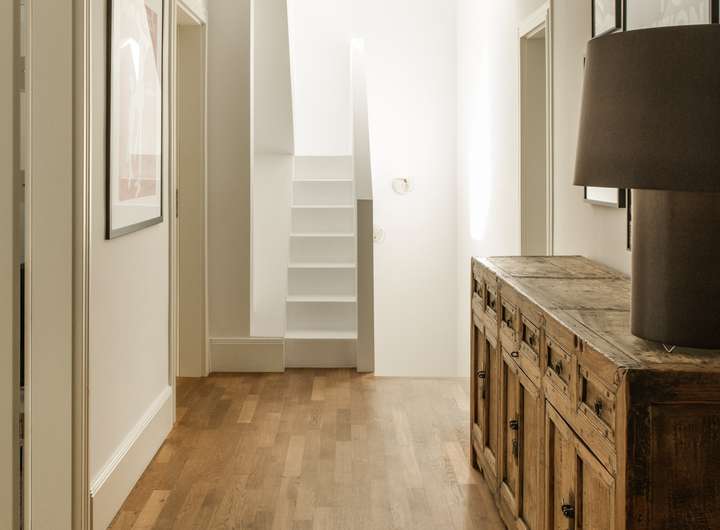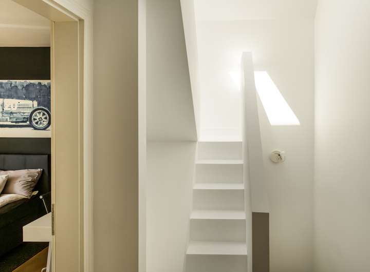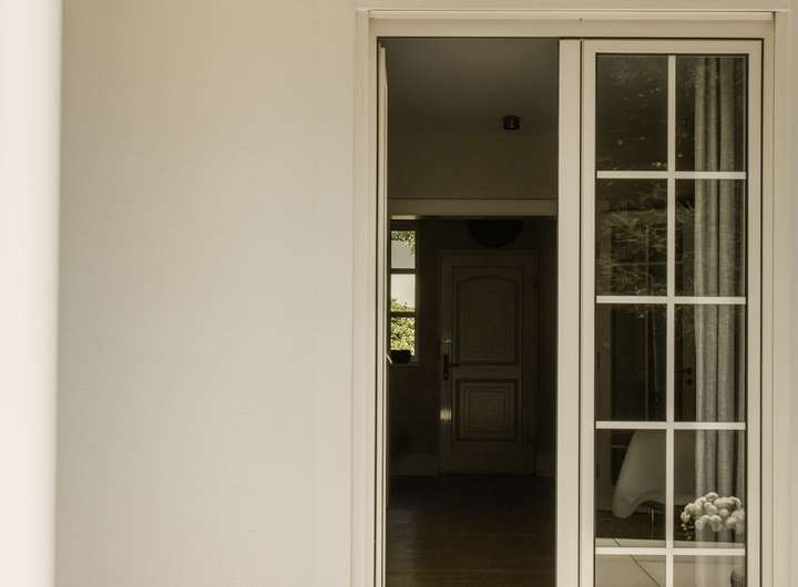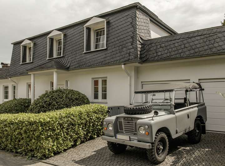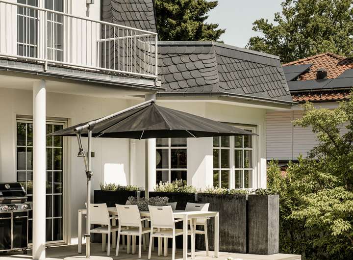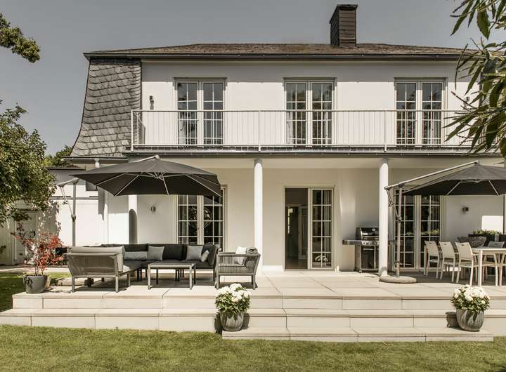 Von außen strahlt die Villa eine zurückhaltende, zeitlose Eleganz aus. Das klassische Mansarddach mit hochwertigem Schiefer aus feinen, schuppenartigen Ziegeln bildet einen harmonischen Kontrast zur minimalistischen weißen Putzfassade – eine Verbindung aus Tradition und Moderne, die dezent die Geschichte des Hauses erzählt.