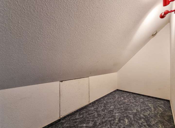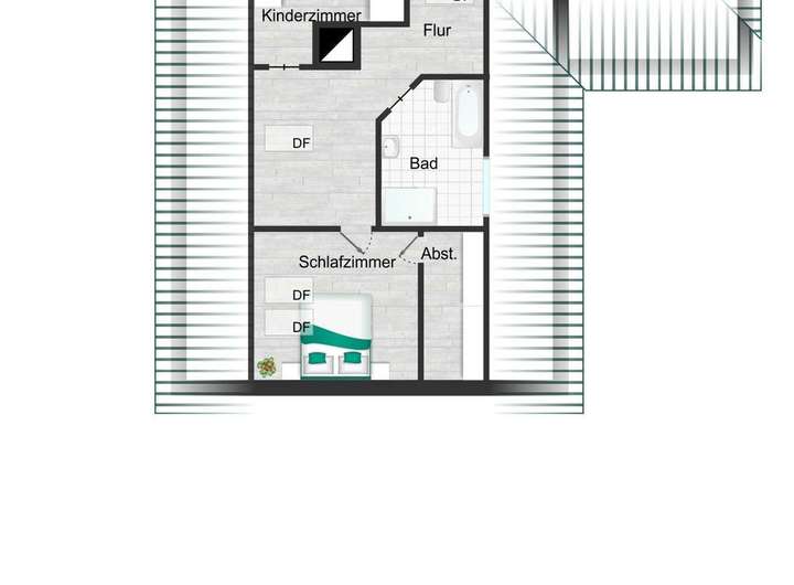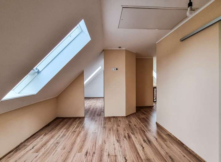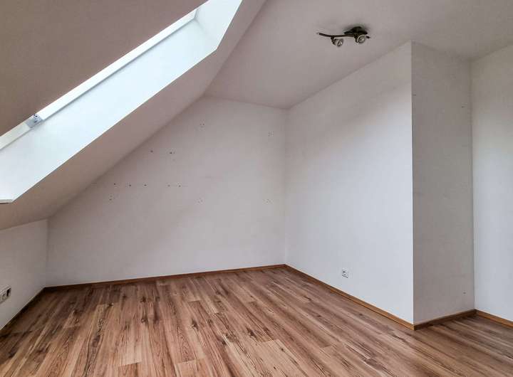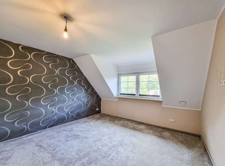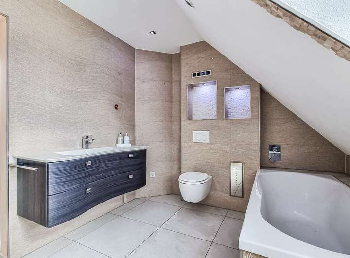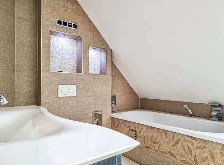 Im Dachgeschoss finden Sie zwei helle und gut geschnittene Räume, die vielseitig genutzt werden können. Das Schlafzimmer beinhaltet zudem ein begehbares Ankleidezimmer. Das Tageslichtbad ist mit einer ebenerdigen Dusche, einer Badewanne und einem formschönen Waschbecken mit Unterschrank ausgestattet. Es bietet eine perfekte Ergänzung für das Wohnkonzept der oberen Etage.
