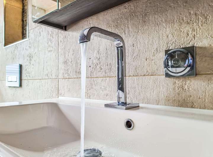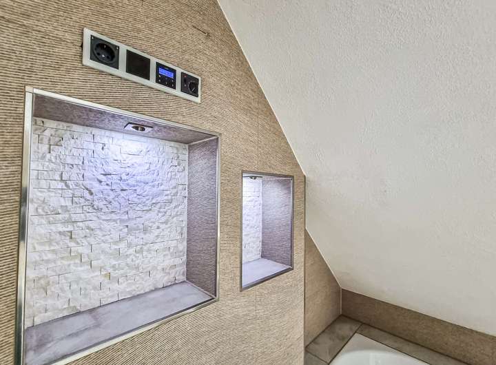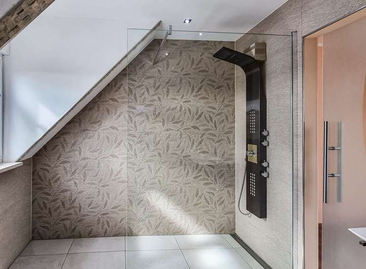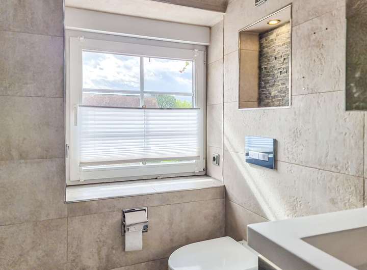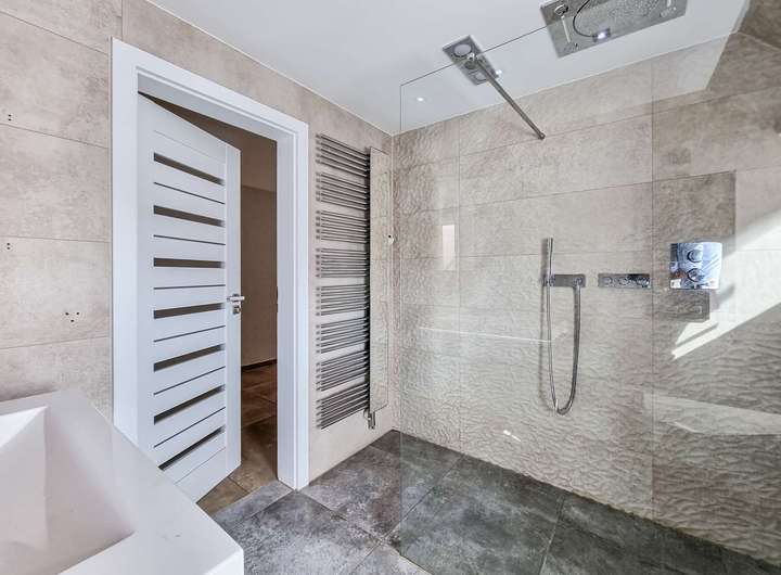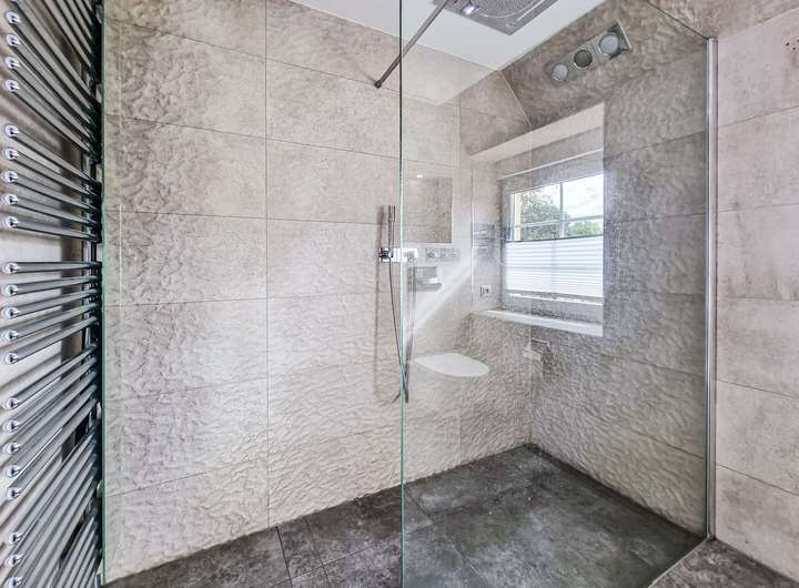 Ein modernes Tageslichtbad überzeugt mit einer ebenerdigen Regenfalldusche von GROHE Spa mit Licht- und Musikmodulen, einem Handtuchheizkörper, einem großen Wandspiegel sowie einem hochwertigen Waschbecken mit Unterschrank. Die exklusiven Wandfliesen und die Wohlfühlbeleuchtung schaffen eine angenehme Atmosphäre. Zudem sorgen Downlights und die Fußbodenheizung für zusätzlichen Komfort.