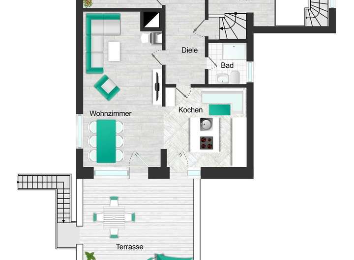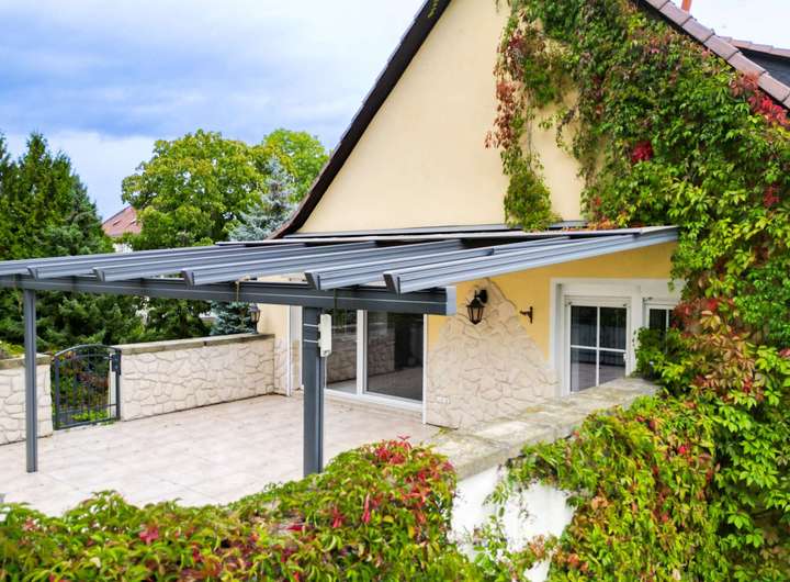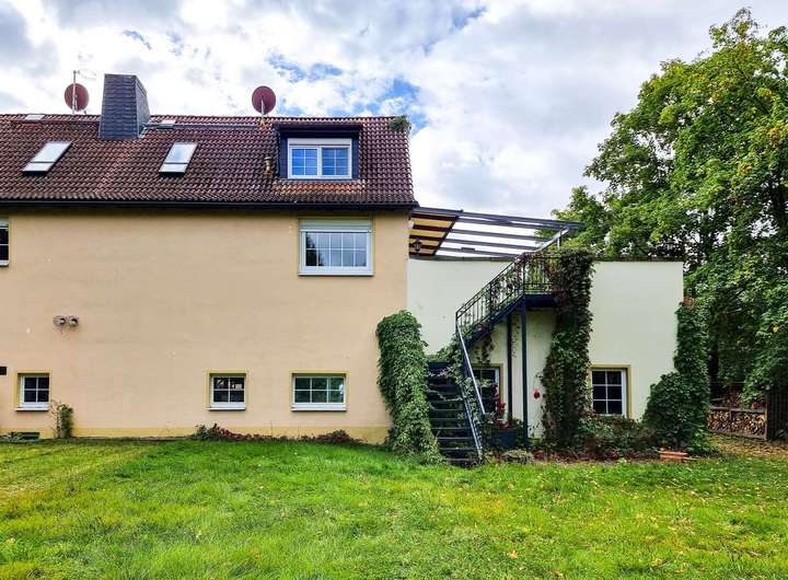 - Terrasse (43,91 m²) mit Markise und Außentreppe in den Garten