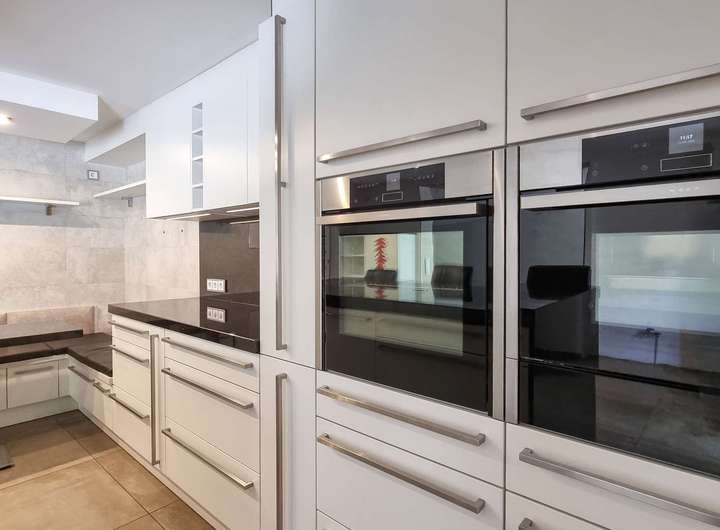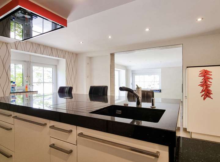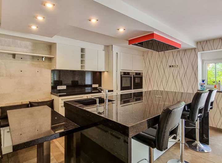 Die Küche ist mit einer modernen Einbauküche ausgestattet, die mit Einbaubackofen, Dampfgarer, Wärmeschublade und einer großen Kochinsel mit Deckendunstabzugshaube keine Wünsche offen lässt. In der Sitzecke mit einer polierten Granittischplatte lässt sich der Kochbereich gemütlich genießen.