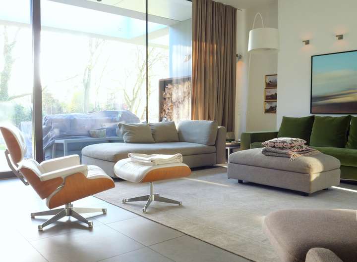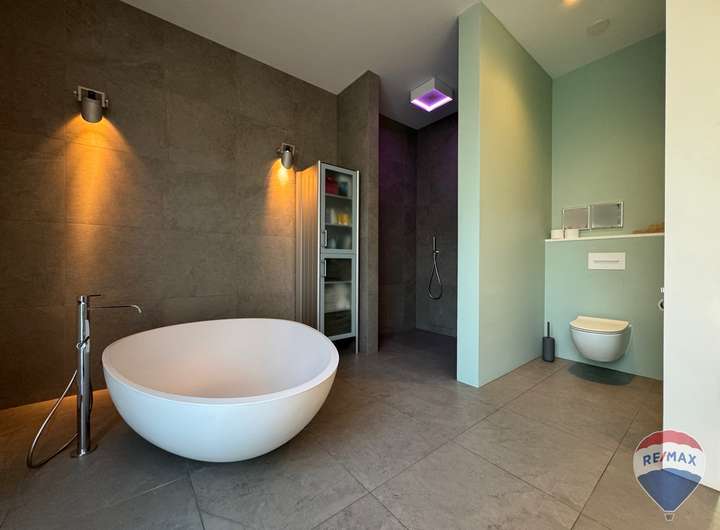 Nach Betreten der Immobilie über den imposanten Hauseingang betreten Sie die imposante Eingangshalle. Hier lässt sich sofort der gehobene Standard der kompletten Immobilie erahnen. Des Weiteren wurde die Villa mit einem beeindruckenden Atrium, einer luxuriösen Einbauküche mit Kochinsel, einem Schlafzimmer mit angrenzendem Ankleidebereich, einem luxuriösen Badezimmer mit barrierefreier Dusche und freistehender Badewanne, einem Gäste-WC, zwei Hauswirtschaftsräume und zwei weiteren Räumlichkeiten zur individuellen Nutzung, ausgestattet. Mittelpunkt und Familientreffpunkt ist zweifelsfrei das großzügige Wohn-Esszimmer mit offenem Küchenbereich. Üppige, bodentiefe Glasfronten machen diesen Bereich zu einer lichtdurchfluteten Oase. Die moderne und technisch hochwertige Einbauküche mit imposanter Kochinsel ist im Mietpreis enthalten. Neben dem Wohnzimmer ist in jedem Schlafraum ein Fernseher vorhanden. Ebenfalls können, nach Absprache mit den Eigentümern, weitere hochwertige Möbelstücke in der Immobilie verbleiben. Gardinen und Lampen verbleiben auf jeden Fall.