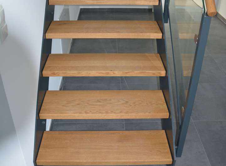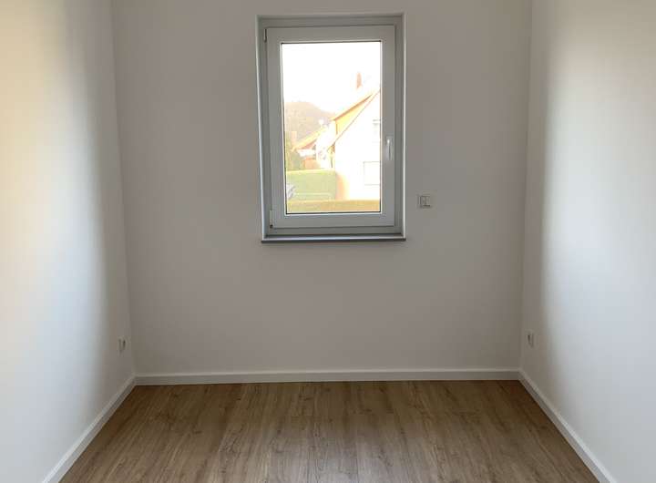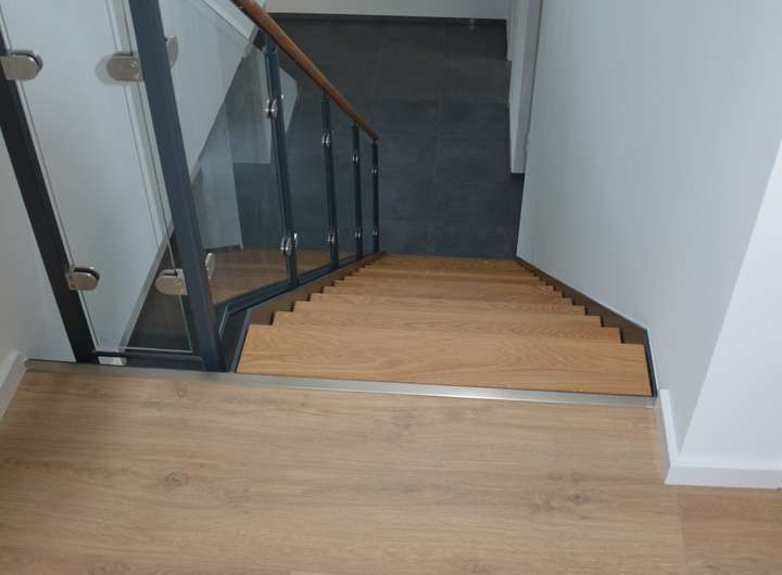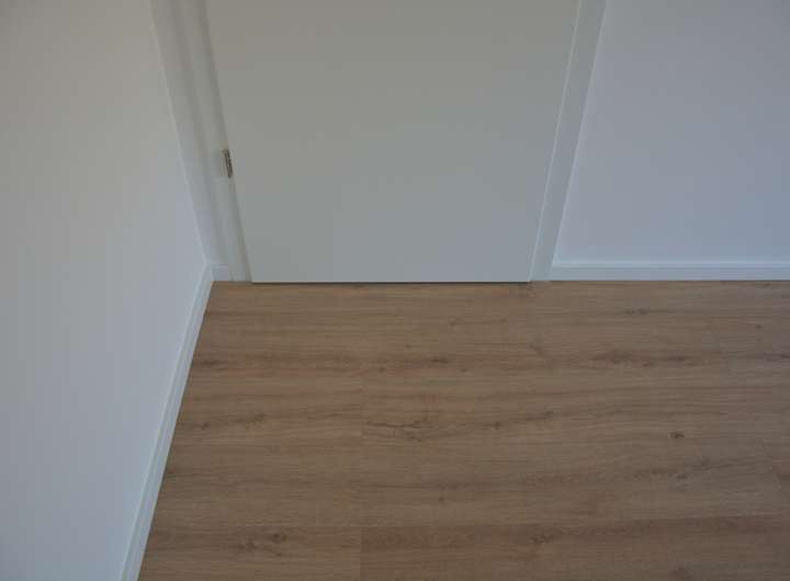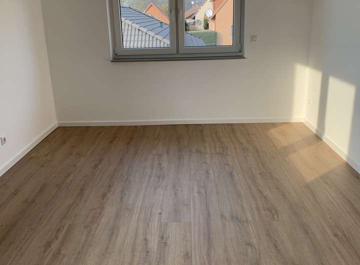 • Laminatboden Dekor Eiche mit weißen Fußleisten im Obergeschoss