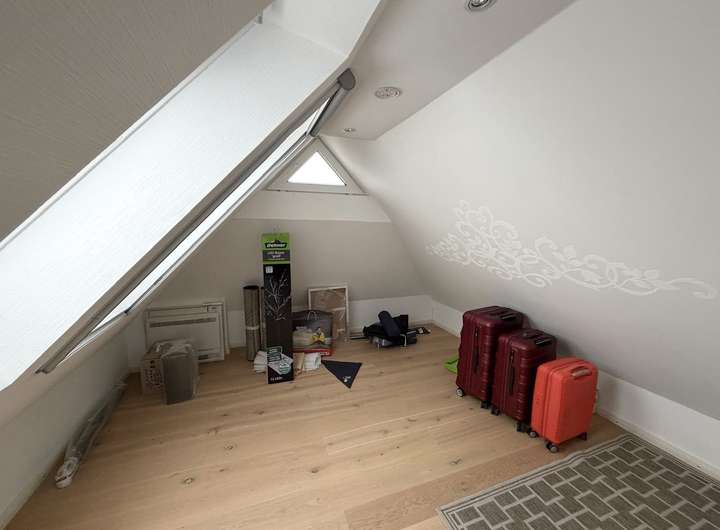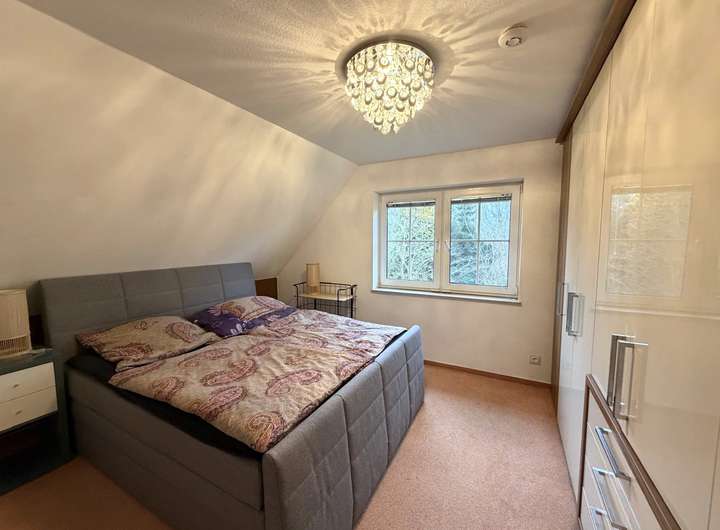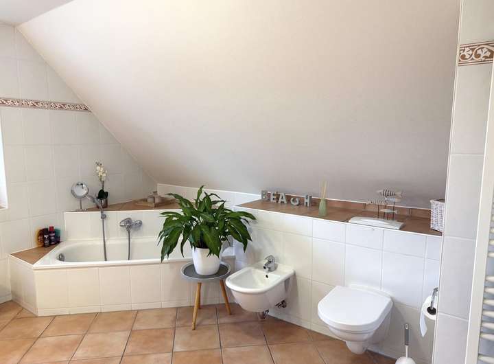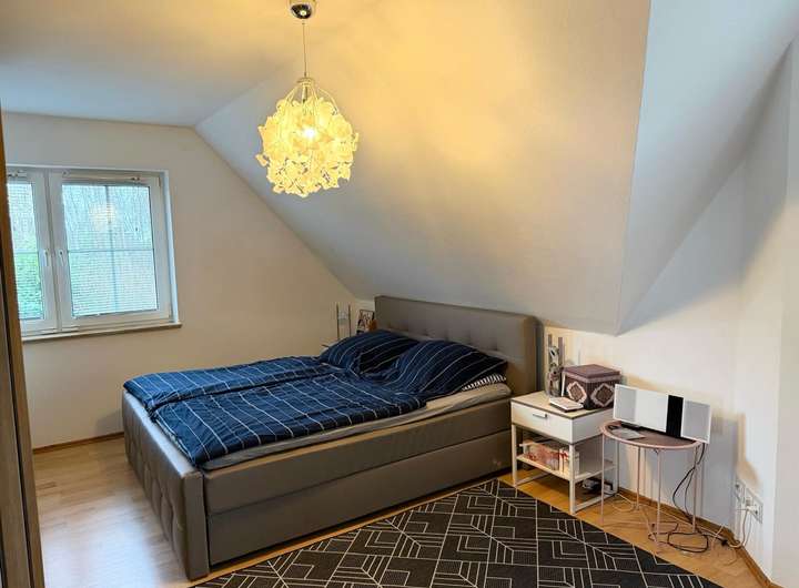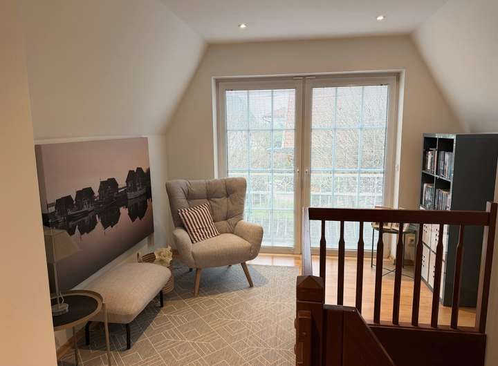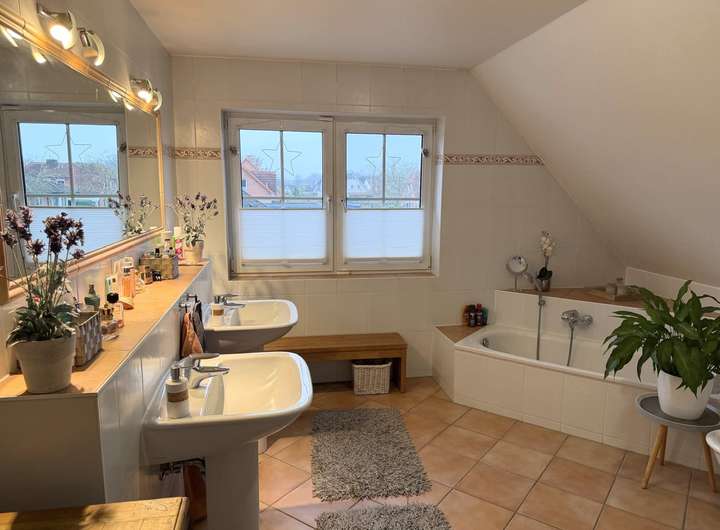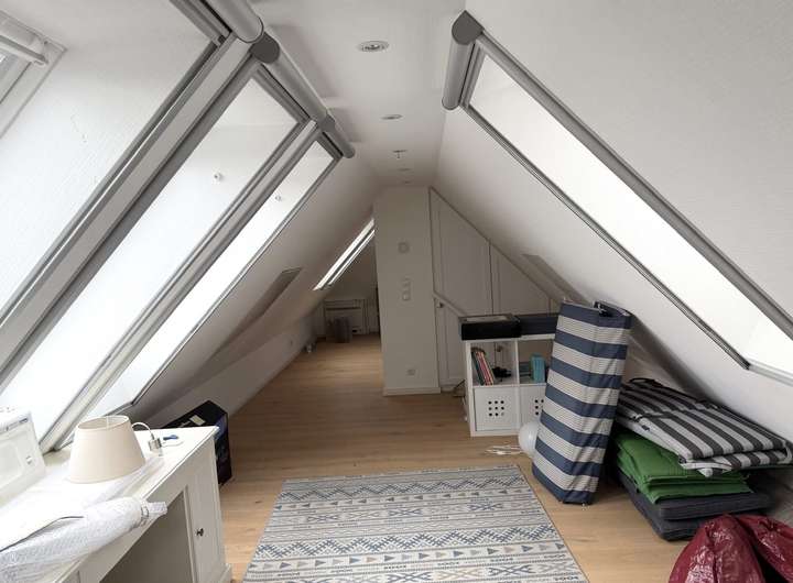 Im Obergeschoss befinden sich das helle Schlafzimmer sowie ein exklusives Wannenbad. Zwei weitere sonnige Zimmer mit Balkonzugang eignen sich ideal als Kinderzimmer. Der ausgebaute Spitzboden bietet zusätzlich ein lichtdurchflutetes Büro sowie ein freundliches Gästezimmer.