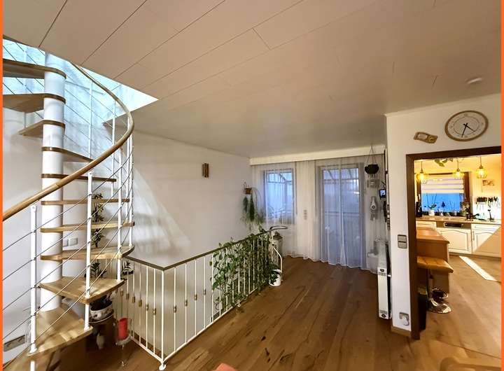 Das wohnlich ausgebaute Dachstudio erreichen Sie über eine Wendeltreppe und ist in der Wohnfläche nicht enthalten.