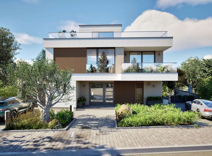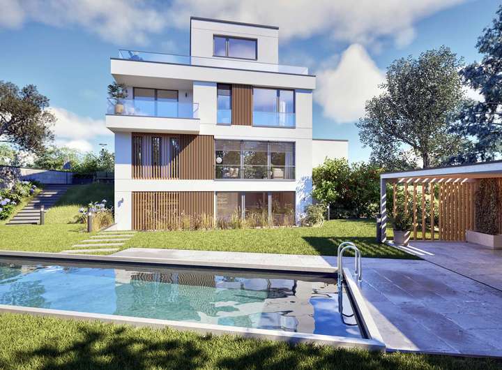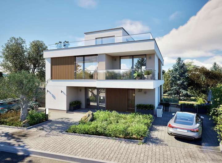 Das exklusive Konzept überzeugt durch klare Linien, großzügige Raumgestaltung und modernste Technik. Ein optionaler Aufzug verbindet alle Etagen barrierefrei. Im Erdgeschoss beeindruckt der weitläufige Empfangsbereich mit Garderobe, der in den lichtdurchfluteten Wohn- und Essbereich mit offener Küche übergeht. Auf rund 80 qm schaffen bodentiefe Fenster ein faszinierendes Raumgefühl mit Blick in die Weinberge und auf den etwa 400 qm großen Sonnengarten mit ca. 40 qm großer Terrasse und auf Wunsch mit dem genehmigten Swimmingpool nebst Pool-Haus. Das Obergeschoss ist für drei großzügige Schlafzimmer konzipiert - zwei davon mit Balkon sowie der Masterbereich mit Ankleide und luxuriösem en suite Masterbad. Das Dachgeschoss bildet das architektonische Highlight: ein großzügiger Wohnraum mit vorgelagerter Galerie und einer umlaufenden Dachterrasse von rund 120 qm - ein ganz besonderer Logenplatz mit unvergleichlichem Panoramablick.