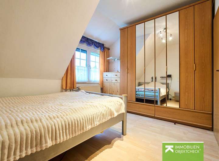 Über eine Treppe im Wohnzimmer erreichen Sie das Dachgeschoss. Auf halber Höhe befindet sich das Tageslichtbad mit Dusche. Darüber hinaus erwarten Sie zwei Schlafzimmer sowie ein praktischer Einbauschrank im Flur. Das Haus ist also ideal für einen Zwei- bis Drei-Personen-Haushalt konzipiert.