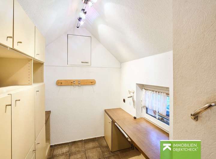 Der Keller beherbergt ein Gäste-WC, die üblichen Hausanschlüsse, die Heizungsanlage sowie Platz für Ihre Waschmaschine und Ihren Trockner. Zusätzlich gehört eine umgebaute Garage zum Objekt - diese bietet zwar keinen Platz für ein Auto, eignet sich aber hervorragend als Stellplätze für Fahr- und Motorräder, als Werkstatt, Hobbyraum oder zusätzliche Abstellfläche.
