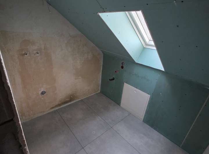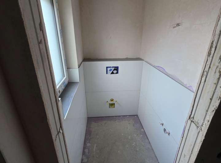 Im Obergeschoss erwartet Sie ein komplett ausgestattetes Badezimmer mit moderner, bodenebener Dusche. Im angrenzenden Hauswirtschaftsraum sind Anschlüsse für Waschmaschine und Trockner vorhanden.