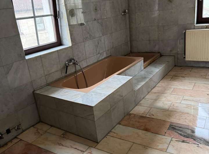 Großes, helles Badezimmer mit Badewanne, Dusche, Fenster