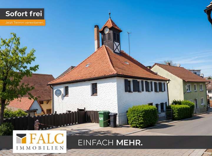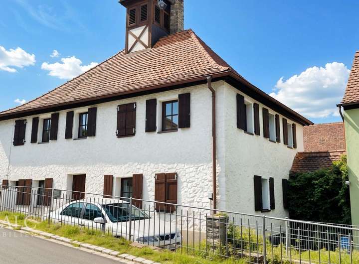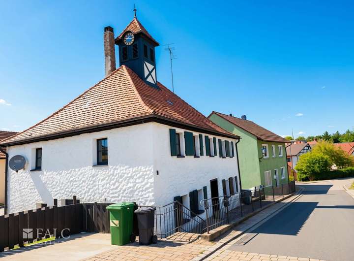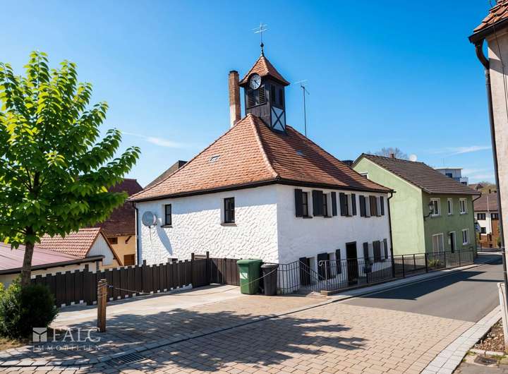 Dieses Einfamilienhaus aus dem Baujahr 1846 steht in einer ruhigen, wenig befahrenen Nebenstraße im Erlanger Ortsteil Vestenbergsrgreuth. Das Gebäude ist ein Baudenkmal und überzeugt durch seinen historischen Charakter. Die Fassade ist traditionell verputzt. Das Walmdach zeichnet sich durch ein besonderes architektonisches Detail aus: mittig sitzt ein Fachwerk-Dachreiter, ausgestattet mit zwei Turmuhren, die dem Haus ein unverwechselbares Erscheinungsbild verleihen.