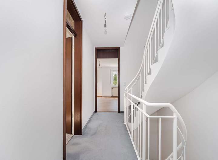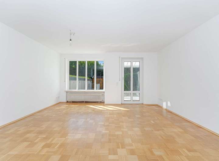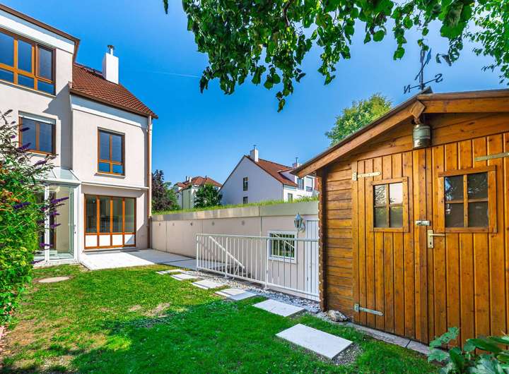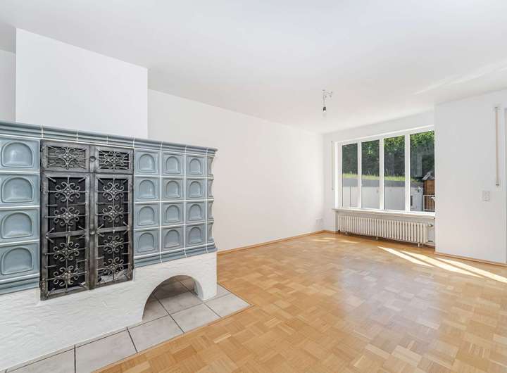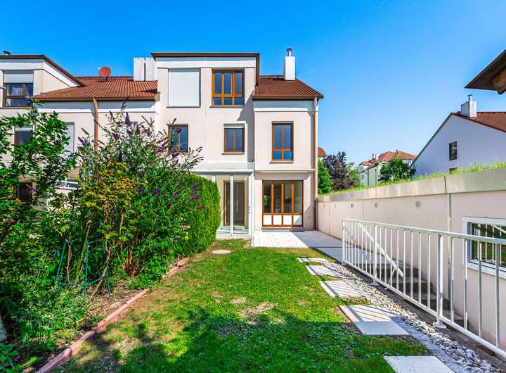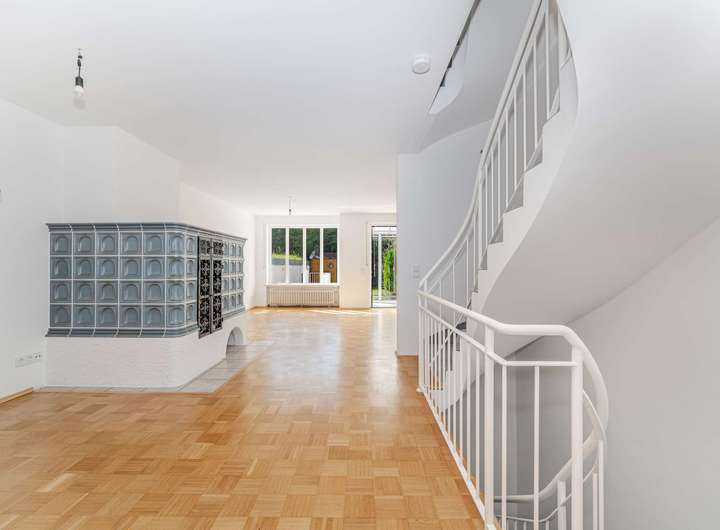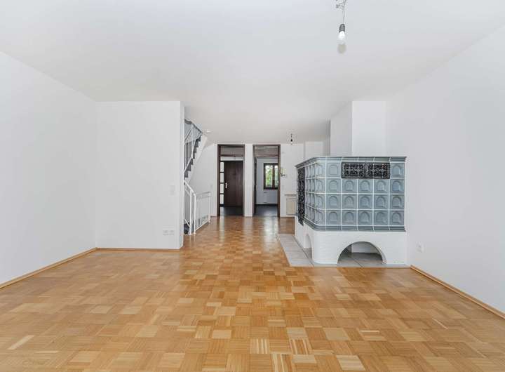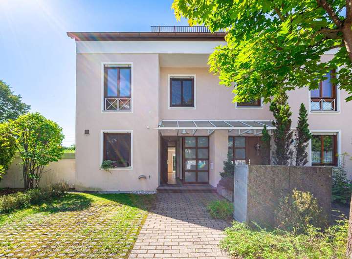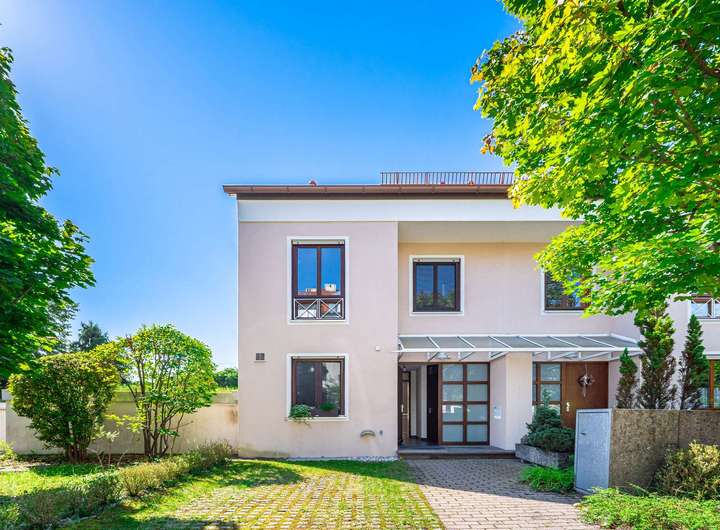 Im Jahre 1988 von einem renommierten Münchener Bauträger errichtet präsentiert sich der Grundriss auch heute noch zeitlos modern. Der Grundriss ist für das moderne Familienleben optimiert: Im großzügigen Erdgeschoß herrscht kommunikative Offenheit im Wohn- und Essbereich. Ein schöner Kachelofen sorgt für Gemütlichkeit im Wohnbereich. Ein geräumiger Wintergarten und die Fensterfronten beziehen den Garten samt Terrasse gleich ganzjährig ein. Das sorgt für ein lichtdurchflutetes, weitläufiges Wohngefühl. Die großzügige Küche und ein Gäste-WC komplettieren das Parterre.