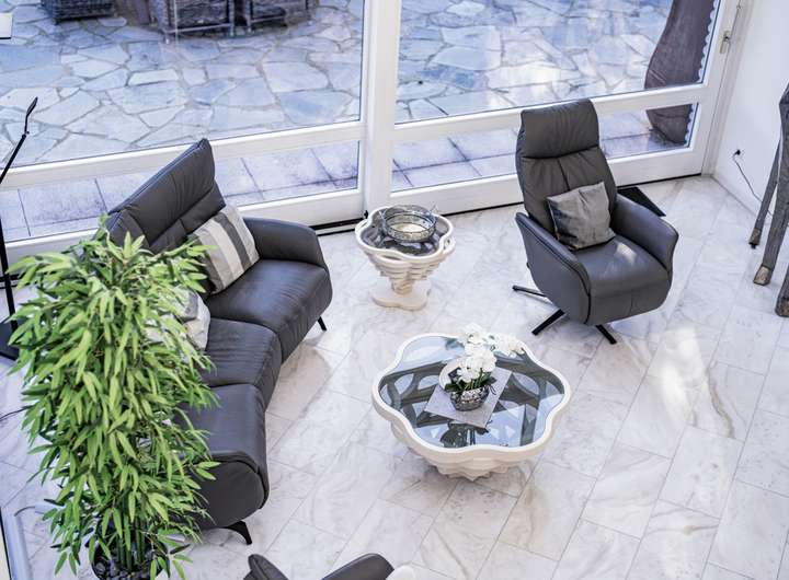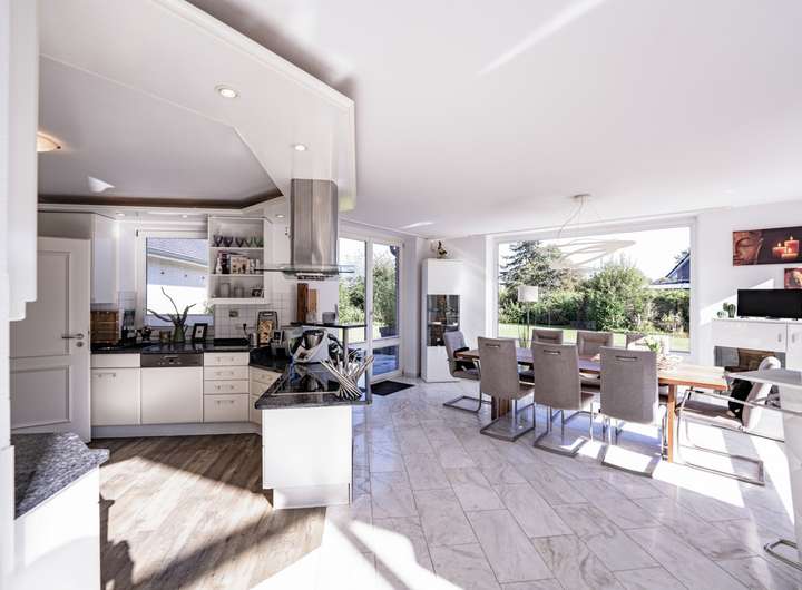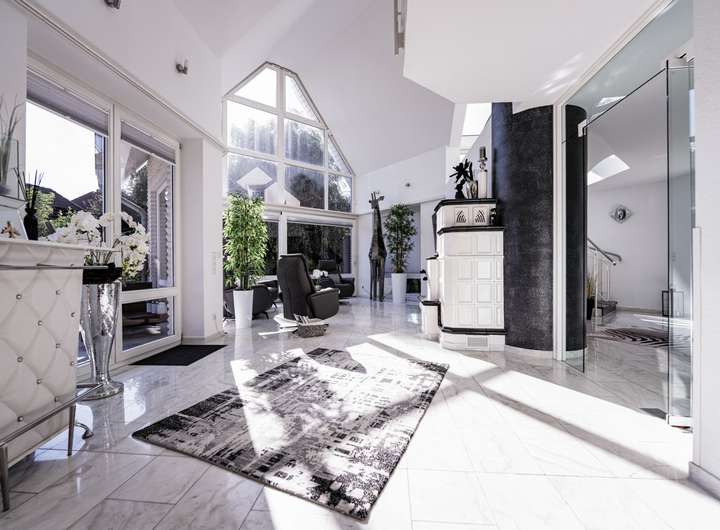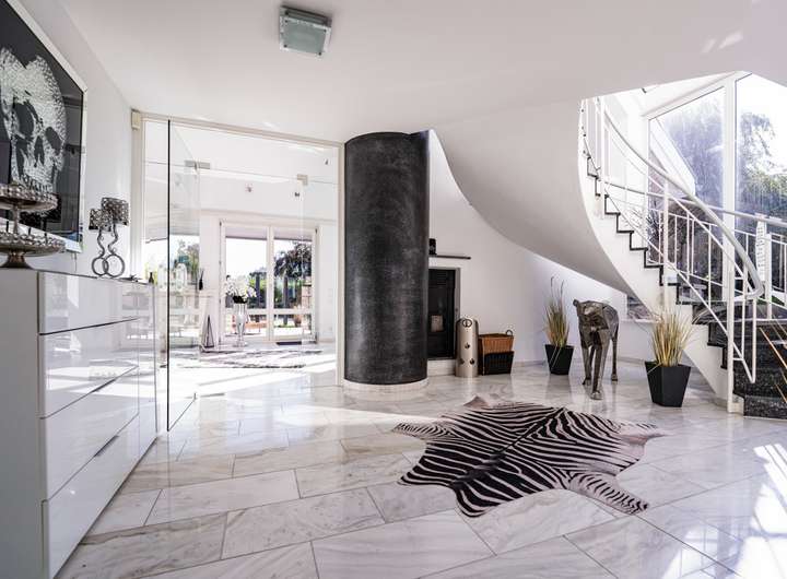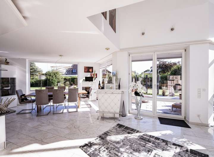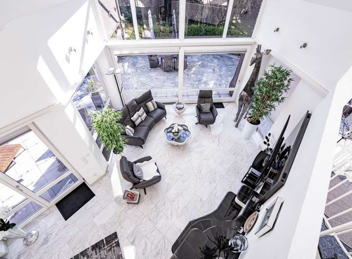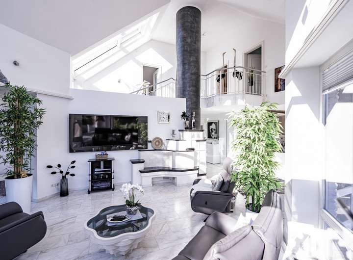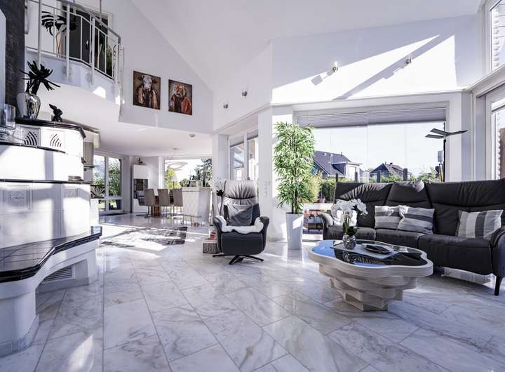 Im Inneren erwartet Sie ein lichtdurchfluteter Wohn- und Essbereich, der durch edlen Marmorfußboden und einen stilvollen Kamin eine warme, einladende Atmosphäre schafft. Eine offene Galerie betont das großzügige Raumgefühl und verleiht dem Wohnbereich eine architektonische Raffinesse, die begeistert.