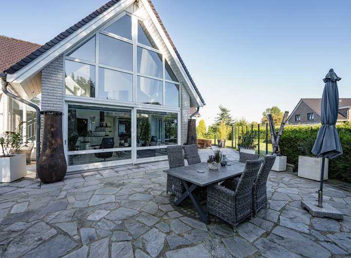 Dieses außergewöhnliche Anwesen vereint modernes Wohngefühl, zeitlose Eleganz und naturnahe Idylle zu einem harmonischen Gesamtbild. Schon beim ersten Anblick beeindruckt die klare Architektur: Großzügige Glasfronten fluten die Räume mit Tageslicht und eröffnen zugleich einen traumhaften Blick auf die umliegende Landschaft.
