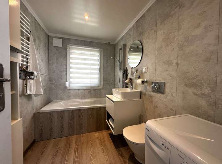 - Badezimmer: Ausgestattet mit Badewanne, Waschmaschinenanschluss, Fenster und eleganten Feuchtraumpaneelen sowie Armaturen in Markenqualität.
