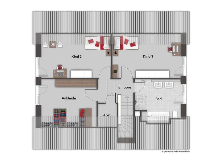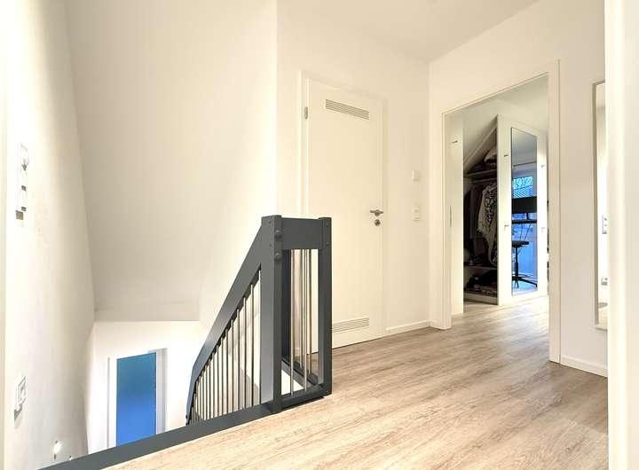 Im Obergeschoss befindet sich das helle Vollbad mit Fenster, Dusche und Badewanne und bietet somit Raum für entspannte Momente. Der begehbare Ankleidebereich mit Einbauschränken bietet viel Platz und unterstreicht den hohen Wohnkomfort. Zwei weitere Zimmer lassen sich flexibel als Kinder-, Gäste- oder Arbeitszimmer nutzen.