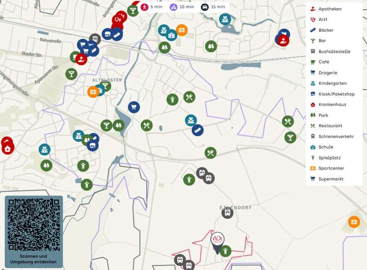 Einkaufsmöglichkeiten für den täglichen Bedarf, Schulen, Kindergärten sowie ärztliche Versorgung sind in kurzer Zeit erreichbar. Auch die Buxtehuder Innenstadt liegt nur wenige Minuten entfernt und lädt mit seinen Cafés und vielfältigen Einkaufsmöglichkeiten zum Bummeln und Verweilen ein.
