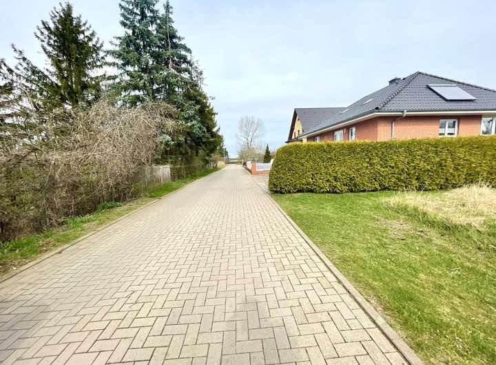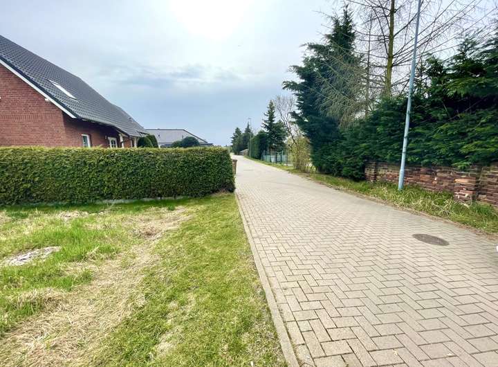 Die Anliegerstraße im vorderen Bereich ist vollständig gepflastert, so dass hier keine weiteren Extrakosten auf Sie zukommen. Zum hinteren Teil des Grundstückes, demnach der spätere Garten, haben Sie eine fantastische Aussicht über grüne Felder und können mit etwas Glück an manchen Tagen die Rehe beobachten.