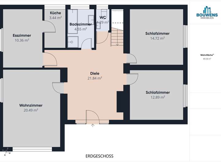 Diele, Wohnzimmer, Küche, Badezimmer, Gäste-WC, 2 Schlafzimmer.