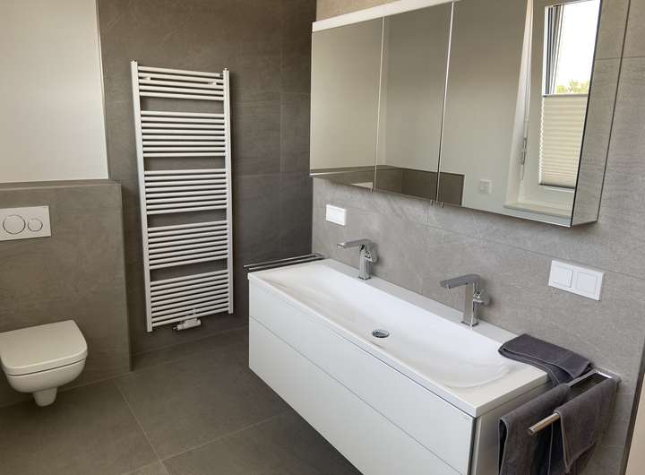 Im 1. OG sind 3 Zimmer, 1 Bad, 1 Abstellraum, im OG neben dem Wohn-/Essbereich noch ein Arbeitszimmer und Gäste-WC. Im Eingangsbereich gibt es einen weiteren großen Raum sowie der Technikraum. Der Eingangsbereich ist mit einer Einbaugaderobe ausgestattet.