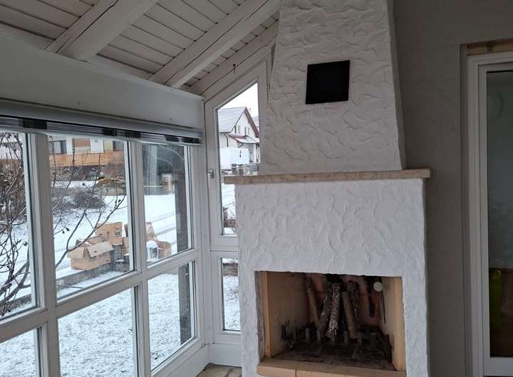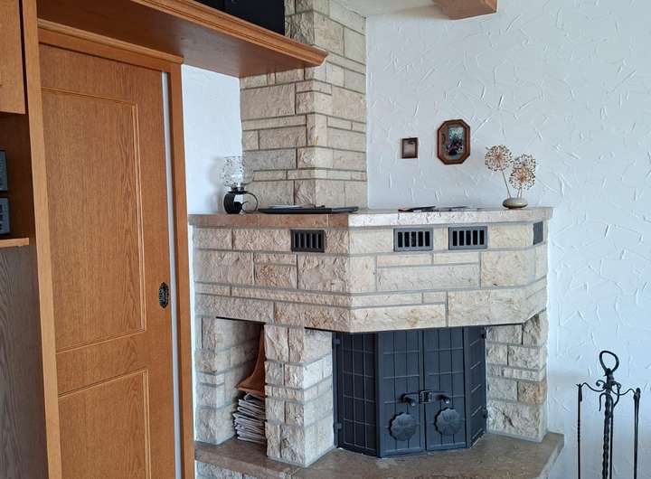 - Kamin in Wohnzimmer und auf dem teilüberdachten Balkon