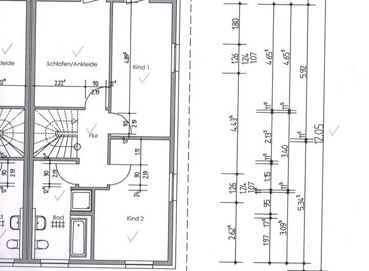 Über die halb gewendelte Treppenanlage erreichen Sie das Obergeschoss mit Flur, Schlafen/Ankleide, Bad und die beiden Kinderzimmer.